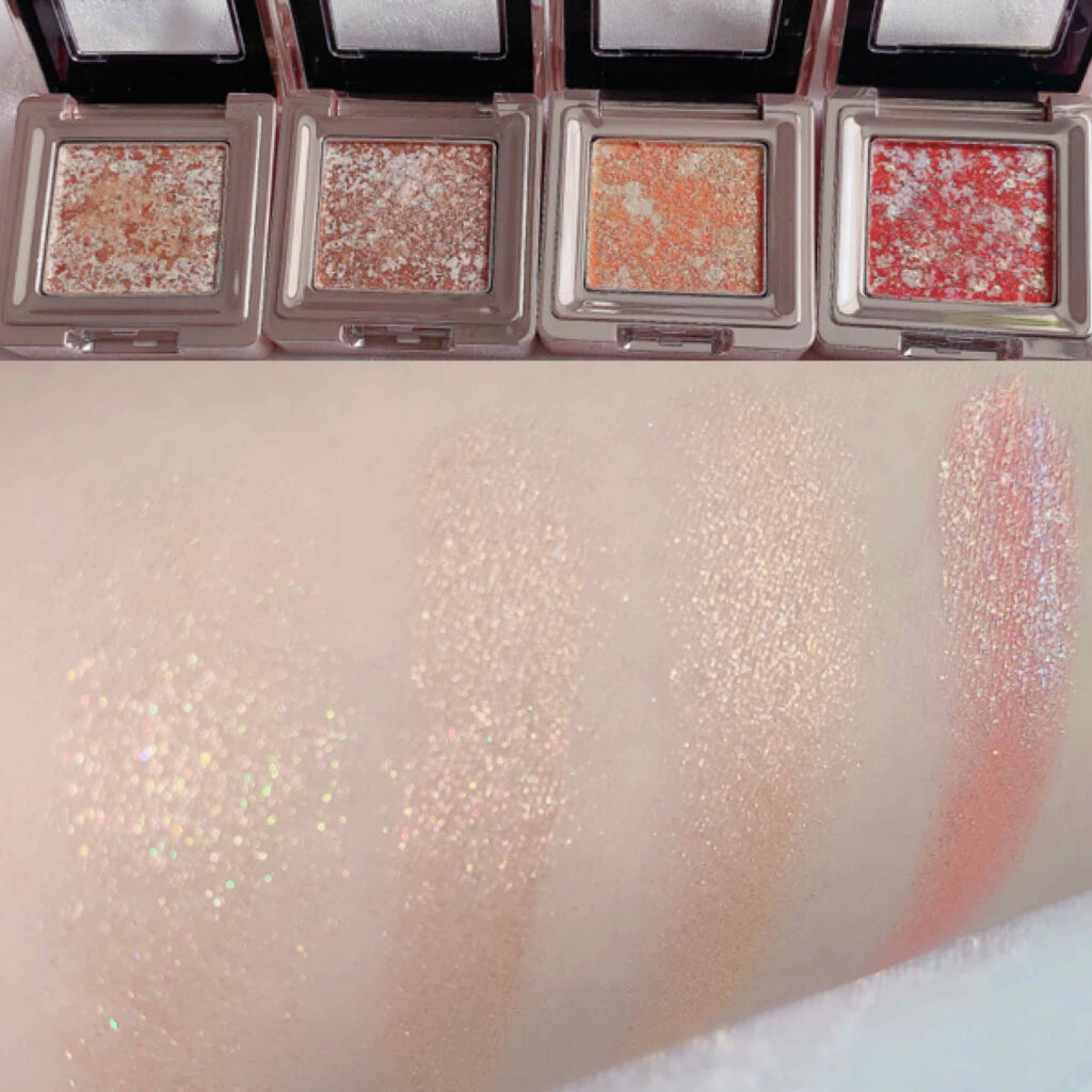 宝石パウダー・偏光パールにより、光の当たり方で色合いが変わるグリッターアイシャドウ。 グリッターと植物オイルを発色のベースとなるカラーパウダーに後から手作業で混ぜこむことで、輝きを最大限引き出しています。 ダイアモンドパウダー、アメジストパウダー、パールパウダー、サファイアパウダー、ルビーパウダーとまぶたをとびきり輝かせる宝石パウダー配合です。さらにイタリア製ホログラムパールも加わり、キラキラ感MAX。 くすみピンクベースにグリーンとブルーグリッター配合で、見た目もピンクが多いのに塗ってみるとほぼグリーンしか見えない👀