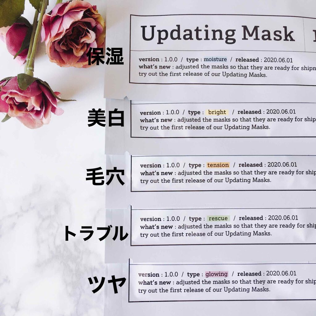 - ããããã®èæ©ã¿ã«æé©ãªåœ¢ãã¯ãã³ãããåæãçãŸãã5çš®ã®ãã§ã€ã¹ãã¹ã¯ããã®æ¥ã®èã³ã³ãã£ã·ã§ã³ãæ°åã«ãã£ãŠéžã¹ãŸãã Updating Mask(ã¢ããããŒãã£ã³ã° ãã¹ã¯) Type M (ä¿æ¹¿) : ã»ã©ãããš3çš®ã®ãã¢ã«ãã³é ž*1ããã£ã·ãå ¥ã£ã極åã·ãŒããæ°Žå èãžå°ãã Type B (éææ) : 3ã€ã®ãã©ã€ããã³ã°æå*2ã§èŽ æ²¢ã«éäžã±ã¢ãæããéæææº¢ããèãžå°ãã Type T (æ¯ç©Žå¯Ÿç) : å³éžãããé åæåãæ¯ç©Žæ©ã¿ãå šæ¹äœãã解決ããããªãšåŒŸåããèãžã Type R (èãã©ãã«) : ãã©ãã«ãæ°ã«ãªãææèã«ãã²ãããçŸå®¹æ¶²ãã£ã·ãã®é«å¯çã·ãŒãã§èèã察çã Type G (ãã€) : ã¢ã«ã¬ã³ãªã€ã«iné«ä¿æ¹¿ã·ãŒã&ãã€ã¢ã·ã³ã¢ããã§ãã¡ã®æŽã£ããã€èãžã *1 å æ°Žåè§£ãã¢ã«ãã³é žãã¢ã»ãã«ãã¢ã«ãã³é ž Naããã¢ã«ãã³é ž Na *2 ã°ã«ã¿ããªã³ãã¢ã«ããã³ã3-O-ãšãã«ã¢ã¹ã³ã«ãã³é ž(ä¿æ¹¿æå)