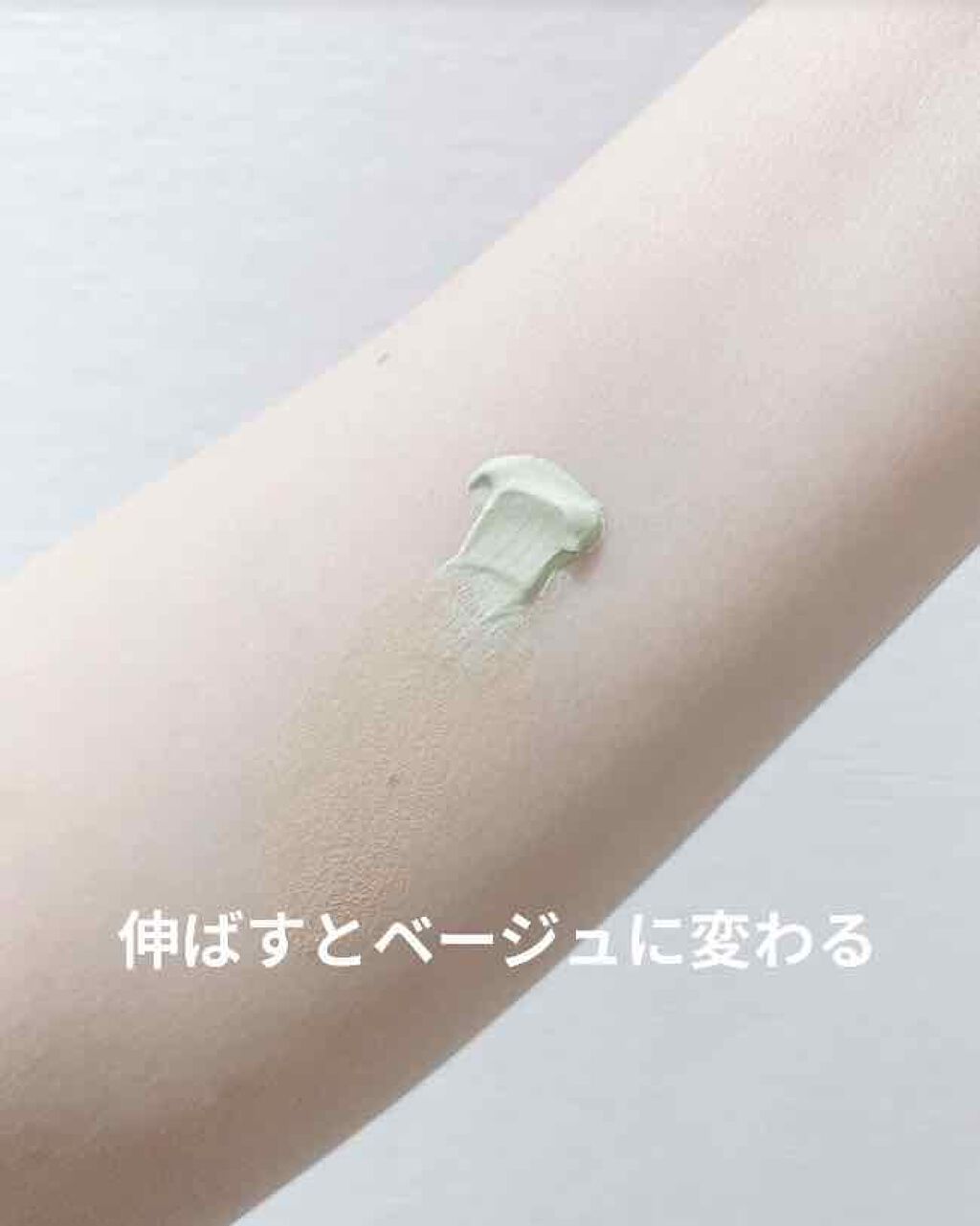 - 赤みをきちんとカバーするスキンケア兼用下地。緑色のクリームが肌でベージュ色に変化し、ニキビ跡やくすみをカバーします。