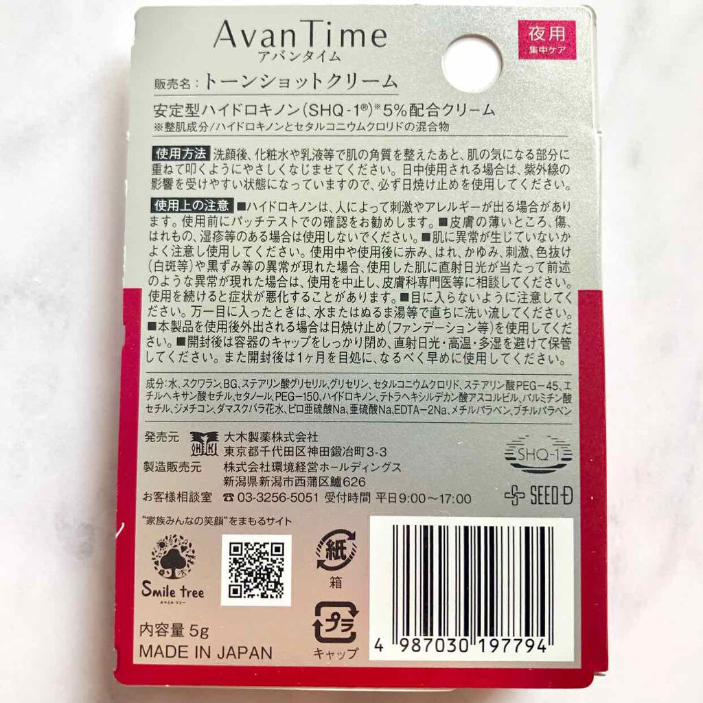 - 「アバンタイム トーンショットクリーム」は安定型ハイドロキノン SHQ-1を5%配合したクリームです。成分が徐々に溶け出しターゲットエリアにアプローチする製品設計であるため、肌にやさしく持続的な作用が期待できます。滑らかで密着しやすいクリームタイプなので、気になる部分を集中的にピンポイントケアすることが可能です。夜のスキンケアの最後に、お肌の気になるポイントにご使用ください。
