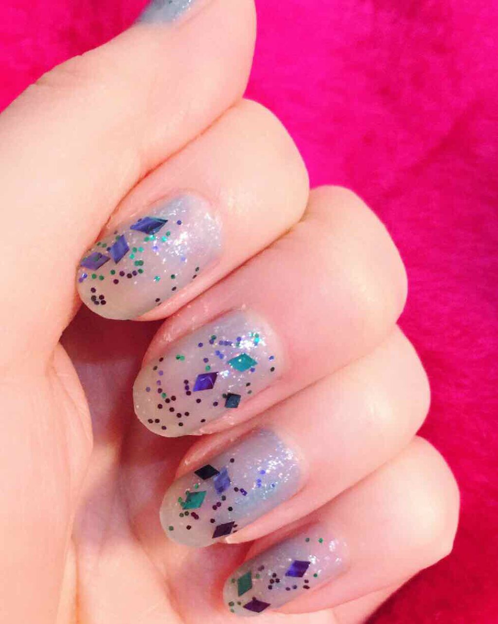 ネイルホリックのパーティーフレーク🎉✨クリスマスっぽい濃いめのピンクにブルー、シルバーの3色(*´◒`*)仕事なので爪の先にちょんちょんと。たまにはこういうのもいいな〜🤗トップコートは相変わらずレブロン💗...