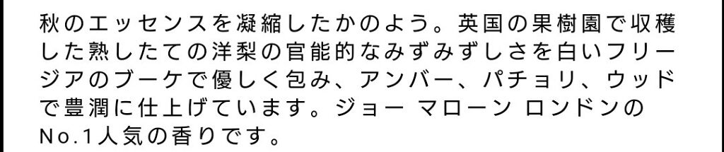 - 秋のエッセンスを凝縮したかのよう。英国の果樹園で収穫した熟したての洋梨の官能的なみずみずしさを白いフリージアのブーケで優しく包み、アンバー、パチョリ、ウッドで豊潤に仕上げています。ジョー マローン ロンドンのNo.1人気の香りです。