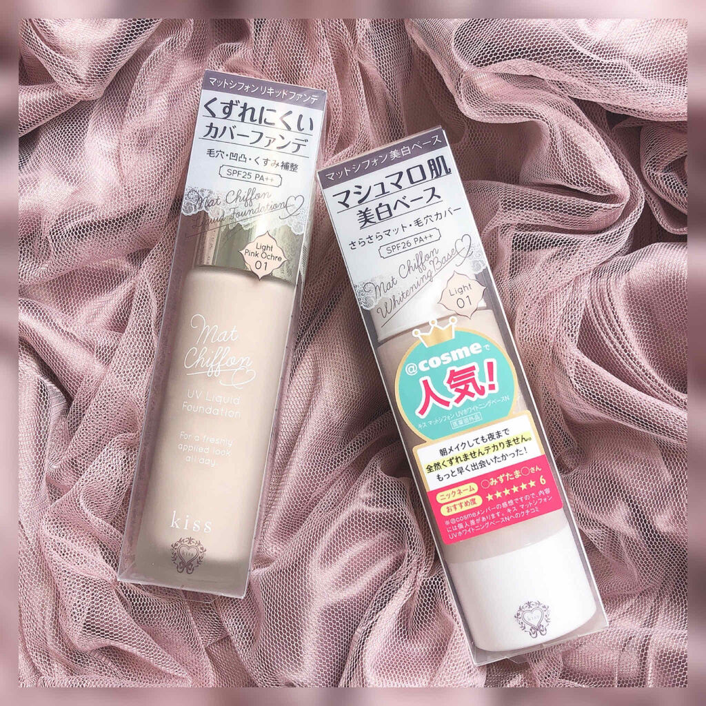 kiss キスマットシフォンUVリキッドファンデ01ライトピンクオークルSPF25/PA++やや重ためなガラスボトルのプッシュタイプ手の甲に出した後傾けても垂れない少し固めのテクスチャ仕上がりはセミマット展開カラーの中では唯一のピンク系だけど...