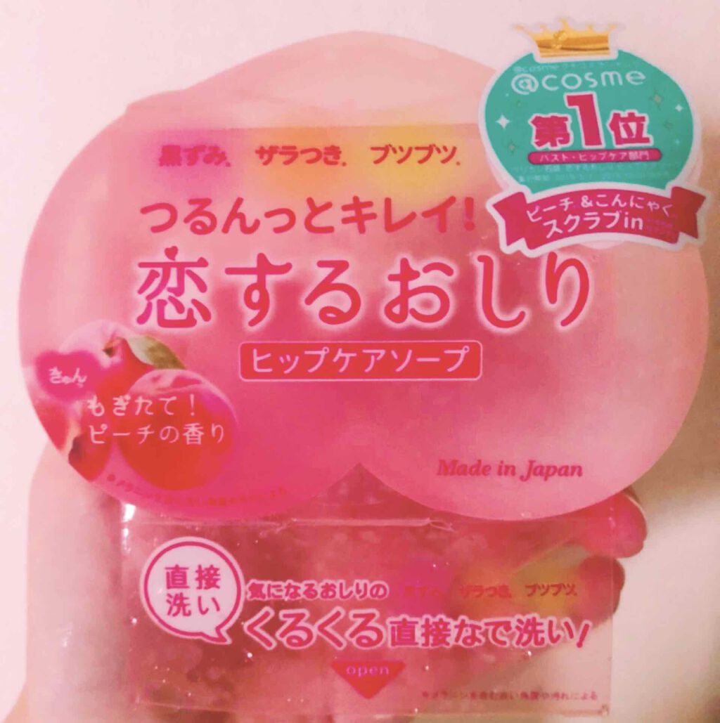 - 恋するおしり ヒップケアソープ おしりの黒ずみ・ザラつき・ブツブツにくるくる直接洗いの簡単ケア! (1)余分な古い角質を落とす:角質ケア スクラブ※1&ピーリング成分※2配合 【モモ核、マンナン※1 グルコノバクター/ハチミツ発酵液、 リンゴ酸・乳酸・クエン酸※2】 (2)必要なうるおいを守る:保湿ケア 6種※3の美容保湿エッセンスを配合 【モモ葉エキス、モモ種子エキス、ビワ葉エキス、キウイエキス、 アーチチョーク葉エキス、アロエベラ液汁※3】 ◎「きゅんっ」とする もぎたて!ピーチの香り