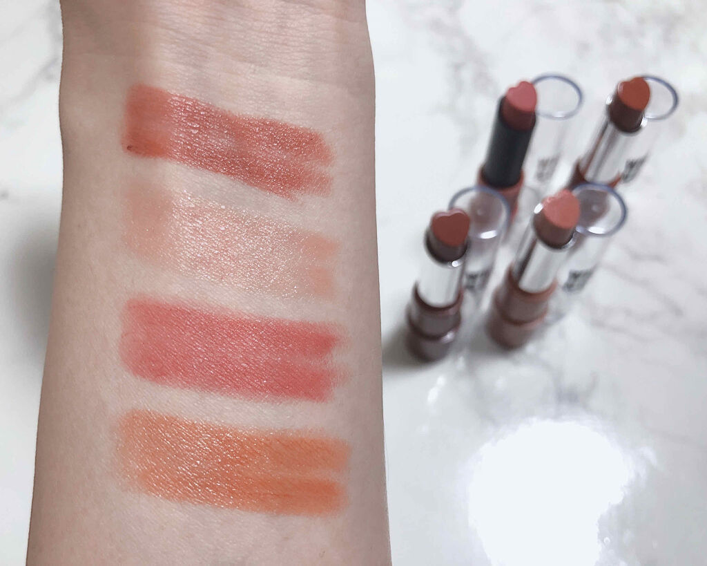 本当にガナッシュみたいなチョコレート色で秋っぽい色味です 発色は問題なしだし、ハート型もかわいいと思うけど、やはり縦じわが目立ってしまう 下にしっとりめのリップクリームを仕込んでから塗ると、いいかも。
