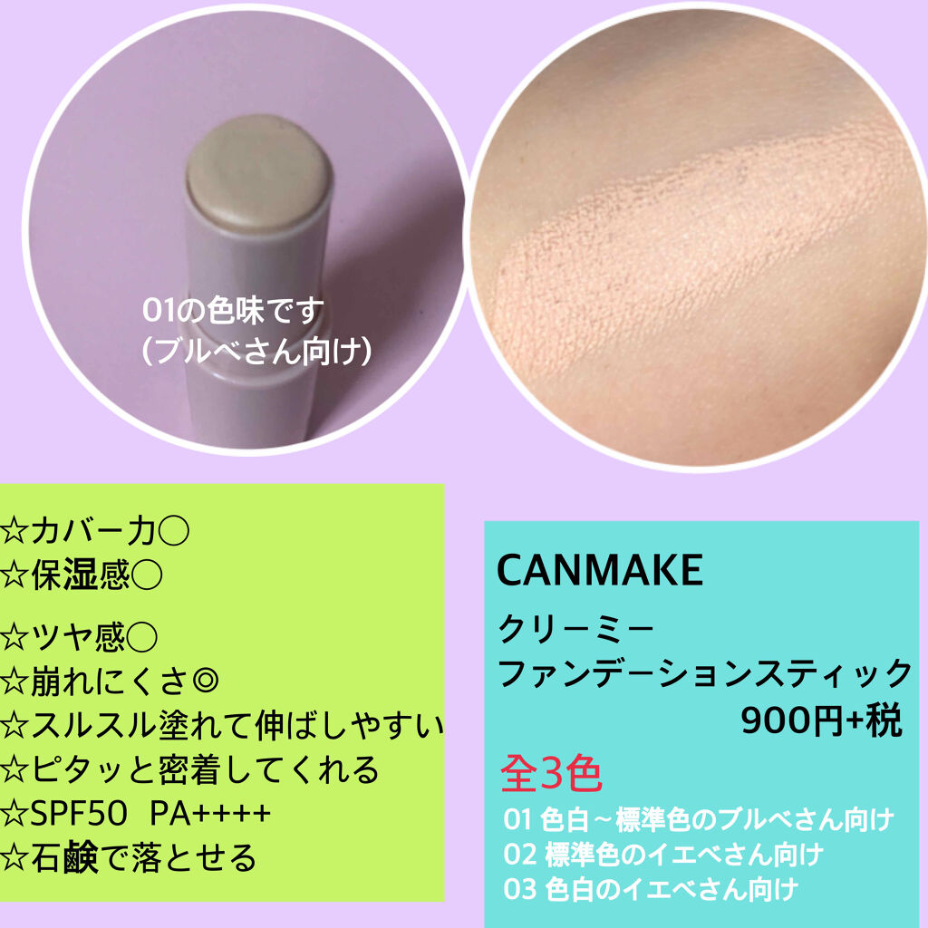 生産終了してしまったけど復活して欲しいファンデーション!こちらは、キャンメイククリーミーファンデーションスティック01ライトベージュのレビューです。 色味は一番明るいライトベージュなので、今の時期にはいいです。更にクリームファンデーションなので、この時期の化粧としては保湿されるので日中も乾燥しずらいです。 欲しい方はセルレやアエナとかで探してみるといいかもしれません。メルカリとかも探してみるといいかも!