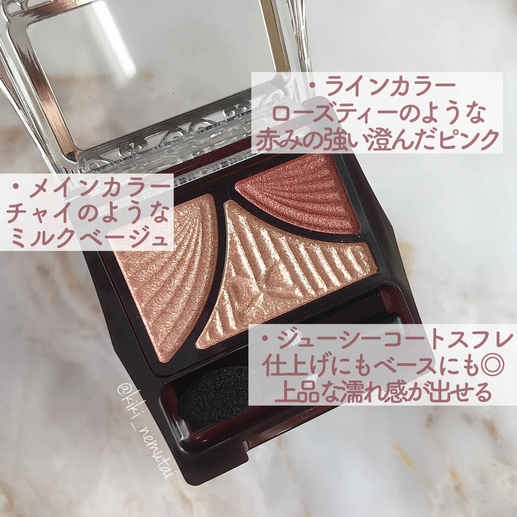 - パウダーなのにみずみずしい♥ 自然な立体感をつくりだす3色アイシャドウパレット 仕上げのコートで、ジューシー感&モチUP! メインカラー&ラインカラーはフィッティングオイル配合のしっとりパウダーで、 まぶたに吸いつくように溶け込み、ジューシーコートスフレで覆うことによって、 濡れたようにツヤめく愛されまぶたで透明感のある目元を演出します。