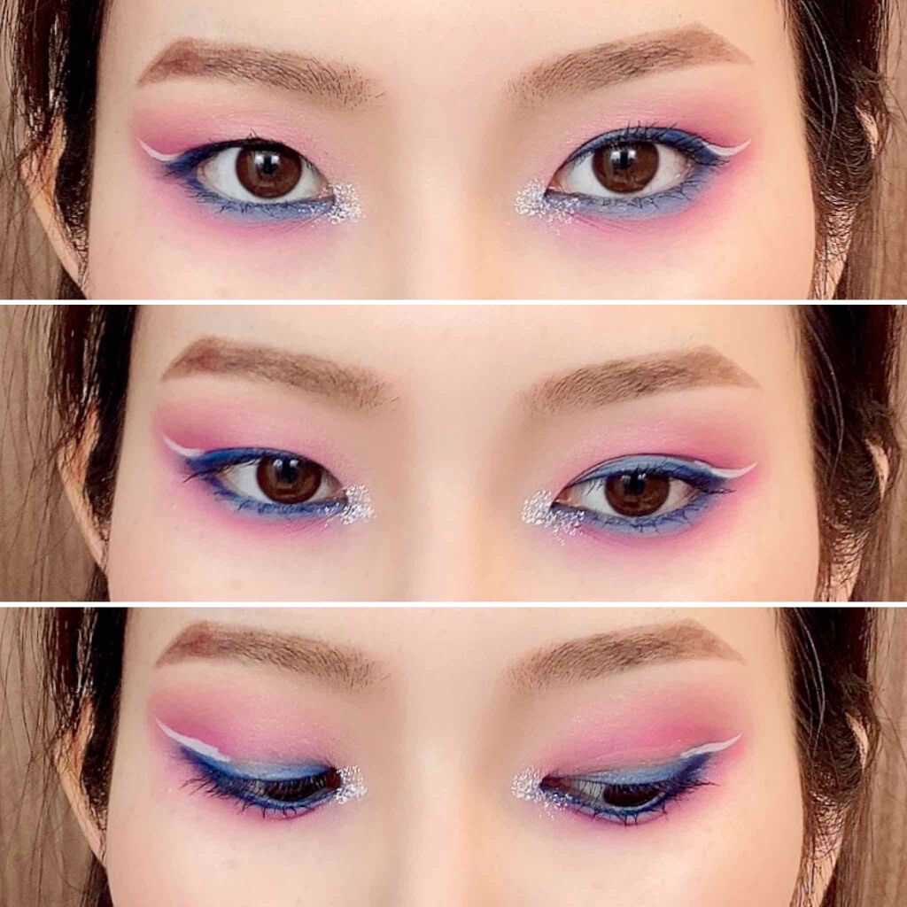 ウィッグに合わせて寒色系のメイクをした時の写真です。 NYXの紫でベース作る カット 水色〜紫のグラデを作る 上からヤバ粉を重ねる って感じで作りました。 カットも複数回重ねて、より境目がパキッとするようにしました。 日常生活ではやらないような派手メイク。やってみると結構ストレス発散になりますよ☺️