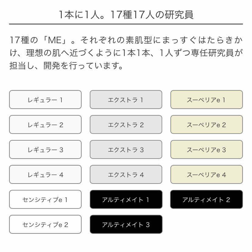 - うるおいで角層を満たし、ふっくらとキメを整えながら、しっとりすべすべとした肌へ導く化粧液。ME レギュラー 2は、みずみずしくなめらかな一方、部分的にカサつきや脂っぽさを感じる、ニキビなどが気になる肌におすすめ。 MEは、一人ひとりの素肌型に合わせて、肌本来の美しさを引き出す化粧液です。肌(角層)をうるおいで満たすことでキメを整え、肌あれを防ぎながらみずみずしい透明感のある肌へ導きます。