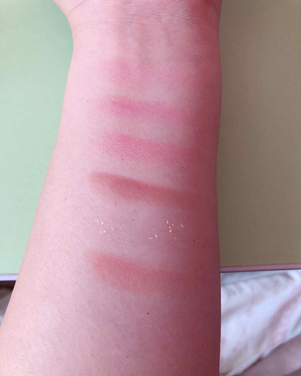 左上のは青ラメも入っててめっちゃかわいいです 右上と左下は肌につけるとそこまで色は変わらなそう??右上のは涙袋によさそう👍🏻✨ くすみカラーで大人っぽく仕上がるので毎日メイクが楽しみです💭 ブラシでぬるとイマイチ発色しなかったので付属のチップか指塗りのほうがおすすめです⭕️
