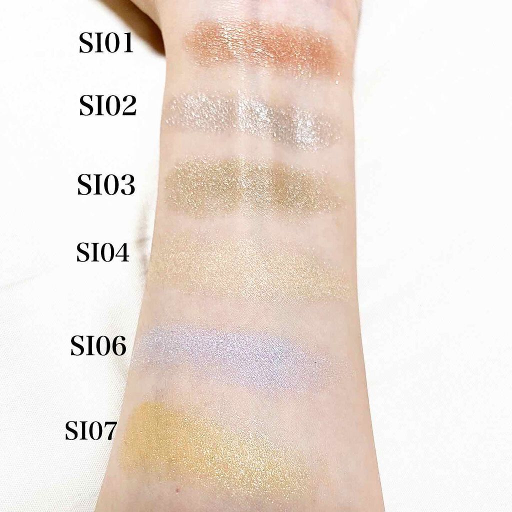 - <SI01ブロンズゴールド> ラウリン酸亜鉛、リンゴ酸ジイソステアリル、トリエチルヘキサノイン、イソステアリン酸水添ヒマシ油、ステアリン酸ソルビタン、トコフェロール、ジメチコン、メチルパラベン、(+/-)(PET/Al)ラミネート、Al、PET、グンジョウ、タルク、ホウケイ酸(Ca/Al)、ポリウレタン-11、マイカ、黄4、金、銀、酸化チタン、酸化鉄、赤104(1)、赤226 <SI02 シルバーホワイト> ラウリン酸亜鉛、リンゴ酸ジイソステアリル、トリエチルヘキサノイン、イソステアリン酸水添ヒマシ油、ステアリン酸ソルビタン、トコフェロール、ジメチコン、メチルパラベン、(+/-)(PET/Al)ラミネート、Al、PET、グンジョウ、タルク、ホウケイ酸(Ca/Al)、ポリウレタン-11、マイカ、黄4、金、銀、酸化チタン、酸化鉄、赤104(1)、赤226 <SI03イエローゴールド> ラウリン酸亜鉛、リンゴ酸ジイソステアリル、トリエチルヘキサノイン、イソステアリン酸水添ヒマシ油、ステアリン酸ソルビタン、トコフェロール、ジメチコン、メチルパラベン、(+/-)(PET/Al)ラミネート、Al、PET、グンジョウ、タルク、ホウケイ酸(Ca/Al)、ポリウレタン-11、マイカ、黄4、金、銀、酸化チタン、酸化鉄、赤104(1)、赤226 <SI04ヌードピンク> ラウリン酸亜鉛、リンゴ酸ジイソステアリル、トリエチルヘキサノイン、イソステアリン酸水添ヒマシ油、ステアリン酸ソルビタン、トコフェロール、ジメチコン、メチルパラベン、(+/-)(PET/Al)ラミネート、Al、PET、グンジョウ、タルク、ホウケイ酸(Ca/Al)、ポリウレタン-11、マイカ、黄4、金、銀、酸化チタン、酸化鉄、赤104(1)、赤226 <SI06 アイスグレー> ラウリン酸亜鉛、リンゴ酸ジイソステアリル、トリエチルヘキサノイン、イソステアリン酸水添ヒマシ油、ステアリン酸ソルビタン、トコフェロール、ジメチコン、メチルパラベン、コンジョウ、タルク、ホウケイ酸(Ca/Al)、マイカ、金、銀、酸化チタン、酸化鉄 <SI08 ピンクライラック> ラウリン酸亜鉛、トリエチルヘキサノイン、リンゴ酸ジイソステアリル、イソステアリン酸水添ヒマシ油、ステアリン酸ソルビタン、ジメチコン、トコフェロール、メチルパラベン、グンジョウ、コンジョウ、タルク、ホウケイ酸(Ca/Al)、マイカ、金、銀、酸化チタン、酸化鉄、赤226 <SI09 ピーチグアバ> ラウリン酸亜鉛、トリエチルヘキサノイン、リンゴ酸ジイソステアリル、イソステアリン酸水添ヒマシ油、ステアリン酸ソルビタン、ジメチコン、トコフェロール、メチルパラベン、タルク、ホウケイ酸(Ca/Al)、マイカ、金、銀、酸化チタン、酸化鉄、赤226