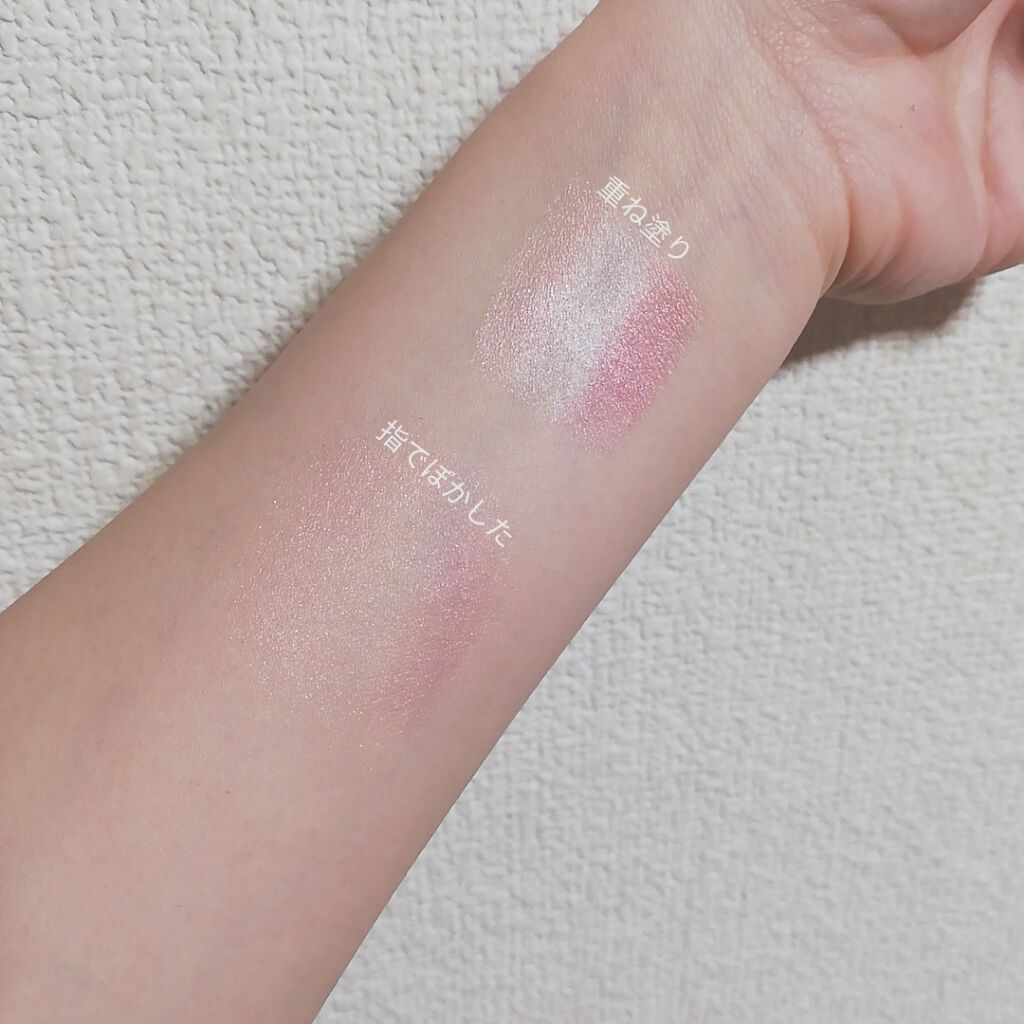 腕に出すとこんな感じにはっきり3色に分かれて色が出てくるよ! ハイライトとチークが一緒になってて時短にもなる。 透明感と血色感が一緒になって、絶妙なバランスがなんとも言えない...✌🏻 ツヤ感のあるチーク求めてる人にピッタリ! ぜひ参考にしてねっ🫧
