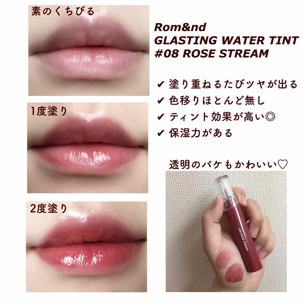 私はリピなし🥲可愛いのに残念だったティント…♡rom&ndグラスティングウォーターティント14MAUVEMOON¥1,320このシリーズのティントは初めて購入しましたがまず、色持ちはすごく良かったです!!飲んだり食べたりしてもきちんと色が残っ...