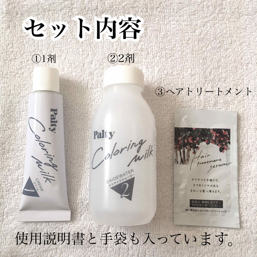 - [医薬部外品] ●髪に密着!トリートメント(※2)感覚で手で簡単に塗布できる、こっくり乳液 こっくり乳液なのでタレ落ちず、手で簡単に塗ることができます。 髪にしっかり密着するからムラなく染まります。 (※2 ヘアトリートメントではありません。) ●髪にやさしいトリートメント成分配合&髪をいたわるヘアトリートメントセラム付き ●内容量1.5倍(※1)たっぷり使ってしっかり染まる ムラなくきれいに染める秘訣はヘアカラーの“使用量”でした! たっぷりの内容量で染めるから「ムラ染まり」になりにくく、きれいに染まります。 (※1 メーカー従来ヘアカラー乳液タイプ比) ●女の子をトリコにするオリジナルカラー名 世界観を演出するため、パッケージの雰囲気とリンクさせたオリジナルカラー名にもご注目! 気分の上がるかわいいネーミングです。 ●牛乳パック型のパッケージ、購入者の共感を呼ぶデザイン 視認性を高め、乳液タイプのヘアカラー剤を連想できる、牛乳パック型のパッケージ。 女の子たちに支持されるナチュラルさ、透明感のあるデザインです。