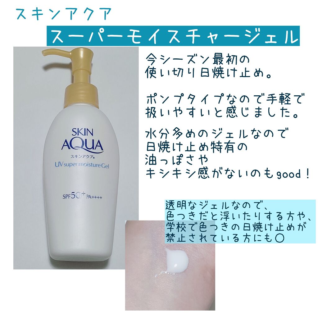 スキンアクアスキンアクアスーパーモイスチャージェル身体用に購入ずっと使い続けているスキンアクア。石鹸で落とせて、SPF50。白い滑らかなジェルがすーっと伸び、ベタつき、きしみ感もなく本当に使いやすいです。塗り直ししてもキシキシしないのも良き。...