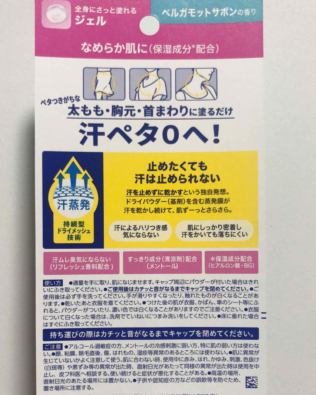 - ペタつきがちな、太もも・胸元・首まわりに塗るだけで汗ペタ0へ 汗を止めずに乾かすという独自発想 なめらか肌に(保湿成分* 配合) *ヒアルロン酸・BG ●持続型ドライメッシュ技術。ドライパウダー(基剤)を含む 蒸発膜が汗を乾かし続けて、肌ずーっとさらさら ●汗によるハリつき感が気にならない ●肌にしっかり密着し汗をかいても落ちにくい ●全身にさっと塗れるジェル ●汗ムレ臭が気にならない(リフレッシュ香料配合) ●すっきり成分(清涼剤)配合(メントール) *ベルガモットサボンの香り