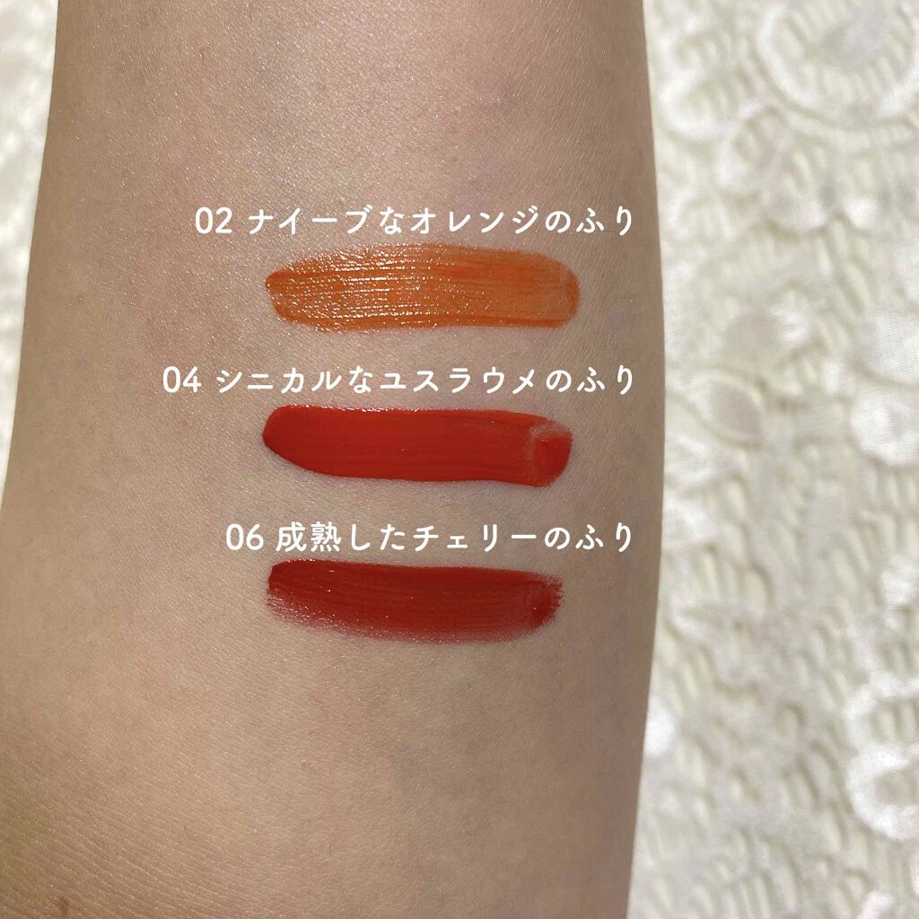 - まるで果実をかじったようなみずみずしいツヤをまとえるツヤ系ティント。 果実をモチーフにした明るいカラー展開で、思わず手を伸ばしたくなる色合いが勢ぞろい。