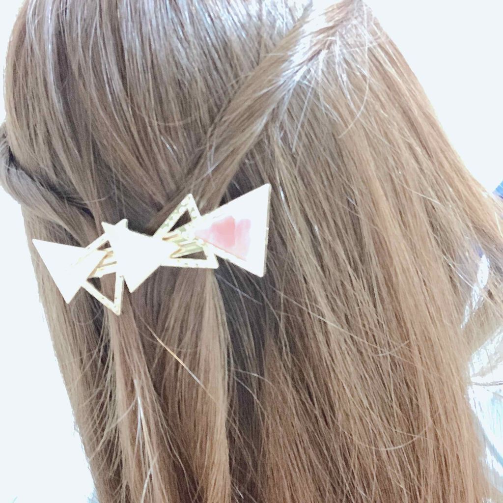 #セリア#セリア#バレッタ#トライアングルシンプルカラートップの髪をクルリンパしてからの後ろの髪を三つ編みにしてちょっと崩して斜めにつけるかクルリンパを2回しても可愛いしそれで三つ編みをサイドのどちらかでお団子のようにしてから斜めにつけても可...