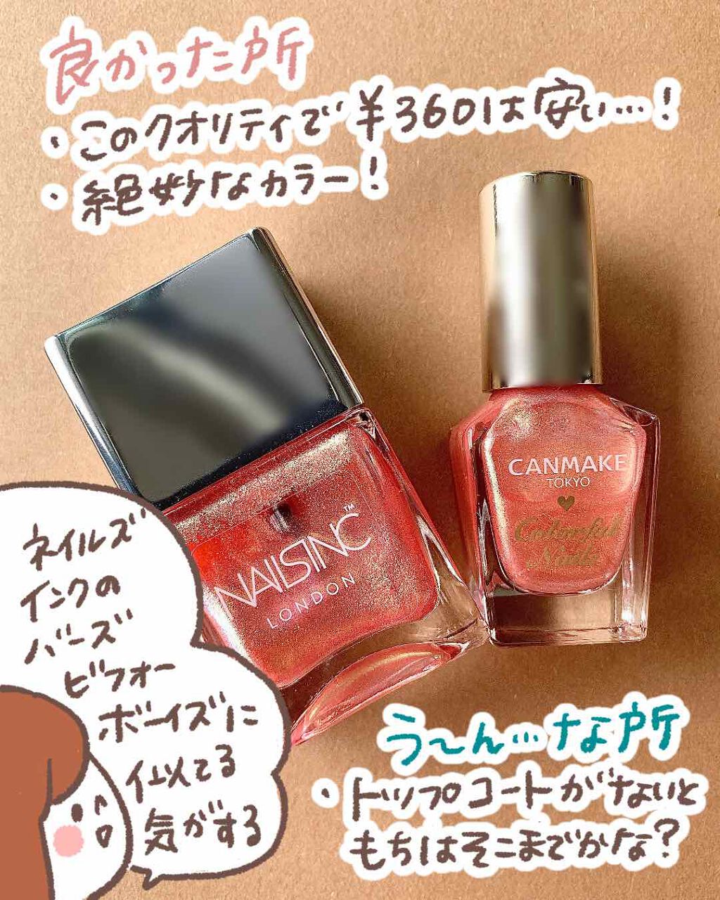 キャンメイクカラフルネイルズN111アプリコットキャンディー肌なじみのよいシアーオレンジ。オーロラホロ入り。ヌーディ×オーロラホロ新しいかも🤭上からシアーカラーを重ねればオーパルのようなアレンジができそう。ファンデーションカラーズ04のホロ入...