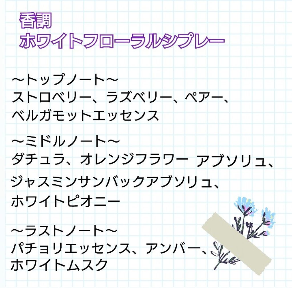 恋愛の絶頂に酔いしれる香り。 甘くセンシュアルなホワイト フローラル シプレー。 甘酸っぱいフルーティな香りが「恋の始まりを告げる出会いの高揚感」を表現 官能的ながら落ち着いた香りが「離れられない、虜になる感覚」を表現