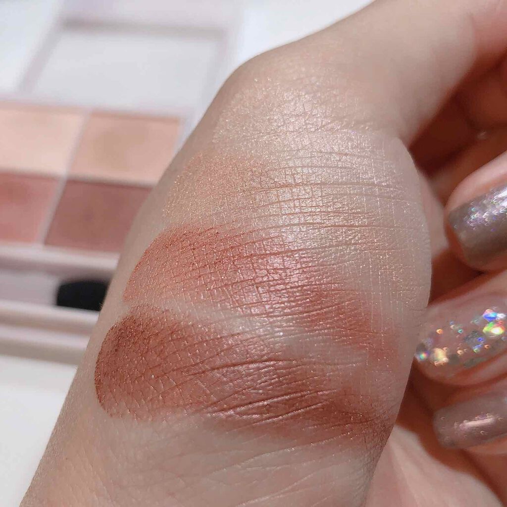 よくパレットのなかで明るいカラーをベースにまぶたに広く塗ることが多いのですが、パール感のあるカラーを避ける🙆♀️! パール感たっぷりの明るいカラーは涙袋に使うぐらい光を集めてぷっくり見せてくれるので、まぶたに広く使うと腫れぼったく見えがち😓 目元を明るくみせてくれたり、次に使うアイシャドウをぼかしやすくしてくれるけど、すっ飛ばしてメインのカラーを塗っちゃう✊🏻❤️🔥 涙袋にはたっぷり塗ってぷっくり見せる🙆♀️💕 シルキースフレアイズのマットタイプはすごく優れているな〜と感じました☺️💗 赤やオレンジなどは、入れすぎると腫れぼったく見えやすいので、見せたいカラーは下まぶた目尻にのせて色をたのしむ♡♡ パール感なしの透けマットだけじゃ物足りない… そう感じさせない華やかなラメが左上に入っているので黒目上と涙袋にのせるとすごく可愛い仕上がりに😍! 厄介な左右差のお陰でマットアイシャドウが好きになりました😌💕