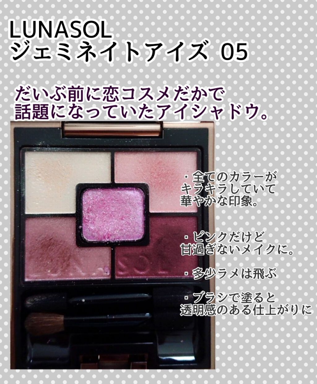 ルナソルのアイシャドウ☁️ 私は奥二重だからピンクメイクは腫れぼったくなりがちで敬遠してるけど、ルナソルのピンクは色味が上品で腫れぼったくならないので好き🥹 そしてなんといってもこのキラキラ感✨✨ 全色キラキラってどういうこと〜!特に真ん中の部分はラメが大粒で涙袋に最適🫶 このアイシャドウ1個で完成するのも楽🫶 LUNASOLジェミネイトアイズ N05RB¥5,500