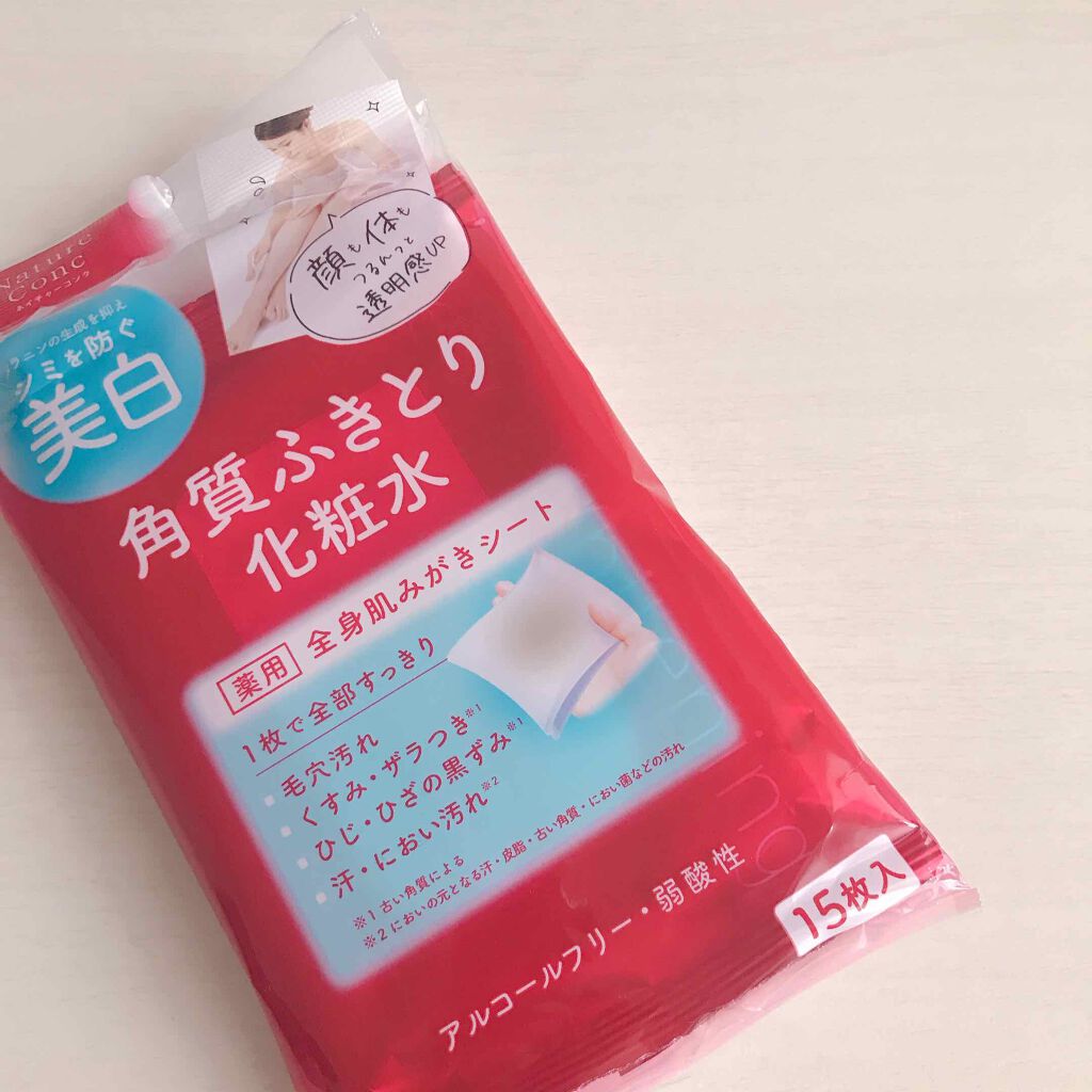 - \いつでもどこでも、顔も体もまるごと美白*&角質ケアできる「ネイチャーコンク」の全身肌みがきシート新登場!!/ ◆素肌を磨き上げる薬用全身美白シート。古い角質をふきとることで、透明感がアップ。 ●ふきとり化粧水をたっぷり含んだ柔らかい3層構造のシートが、古い角質をすっきり取り除き、顔も身体もうるつる肌に導きます。 ●くすみや乾燥の原因となる余分な古い角質や毛穴汚れだけでなく、においの元おとなる汗・汚れ・べたつきなども取り除きます。 ●顔、デコルテなどの全身ケアに。うなじ、腕、脇、背中、脚、デリケートゾーン付近にも。 ●アルコールフリー、無香料、無鉱物油、無タール系色素、弱酸性 <1枚で6役> 美白*、角質除去、朝の洗顔代わり、保湿、肌荒れ防止、浸透アップ <こんな時にオススメ> お風呂後の全身ケア、ジム・ヨガの後、日やけ後の肌に、旅行時のスキンケア、スキンケア時、朝の洗顔代わり、いつもの化粧水代わりにも *美白とは、メラニンの生成を抑え、シミ・ソバカスを防ぐこと