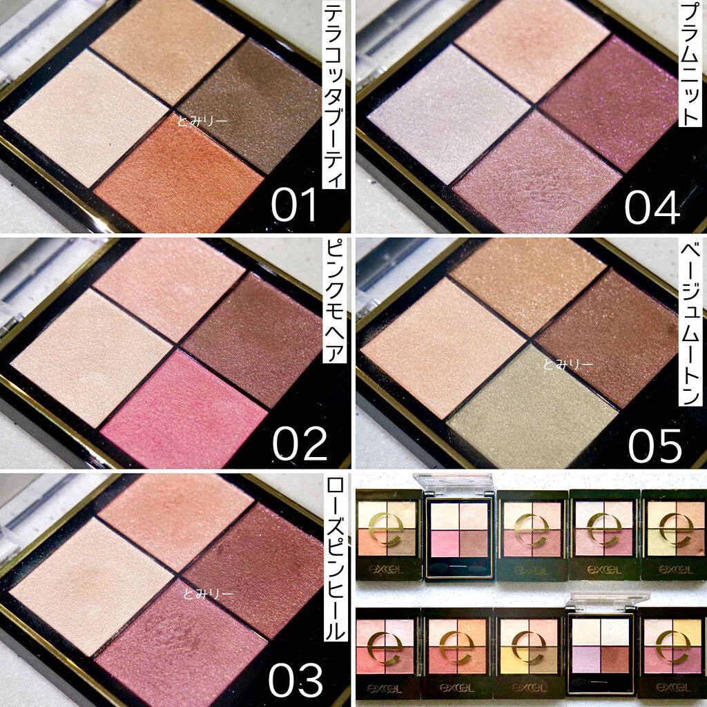 - 1.重ねてもくすまないクリアな発色。ナチュラルに溶け合う絶妙4カラー。 ツヤタイプ(左上・左下カラー):アイホール全体にぼかしたり、目尻へのポイント使いも。 ラメタイプ(右上カラー):アイホール中心や下まぶたにきらめきのアクセント。 マットタイプ(右下カラー):単色で陰影を付けたり、ツヤタイプと重ねてニュアンスをプラス。 2.うっとりするほどリッチな質感で粉飛びしないのに、軽いタッチで伸びて重ねやすいテクスチャー。 3.スクワラン(保湿)配合で目元の乾燥を防ぎます。 [PERFORMANCE] 色と質感の重ね着を楽しむ、ファッション感覚アイシャドウパレット [DESIGN] ・まぶたにひっかからない、なめらかな上質チップ ・薄型コンパクトだからポーチの中でかさばらない [QUALITY] 1.重ねてもくすまないクリアな発色 ナチュラルに溶け合う絶妙4カラー 2.パールの重ね技でまぶたに極上のツヤ感 微細多色 カラーパール 銀コーティング ガラスパール* excel GOLD-MIX処方(金パール配合)* (*右上のシャイニーカラーのみ) 3.うっとりするほどリッチな質感で粉飛び知らず!なのに、軽いタッチで伸びて重ねやすい 4.スクワラン(保湿)配合で目元の乾燥を防ぐ