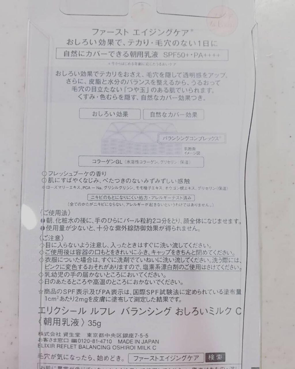 - ファースト エイジングケア※1 おしろい効果でテカリ・毛穴のない1日に 自然にカバーできる朝用乳液 ~ファンデなしの日に~ ※1 今からはじめる年齢に応じたうるおいケア ○テカリ・毛穴を自然にカバーします -余分な皮脂を抑えテカリ・毛穴の目立ちを防ぐ、おしろい効果 ○くすみ・色むらを自然にカバーします -ほんのり色づいて透明感をアップする、トーンアップ効果 ○毛穴の目立たない「つや玉」のある肌に導きます -うるおって皮脂と水分のバランスを整える、スキンバランス処方 ○紫外線から肌を守ります -SPF50+、PA++++ ○フレッシュブーケの香り ○肌にすばやくなじみ、べたつきのないみずみずしい感触 ○ニキビのもとになりにくい処方・アレルギーテスト済 (全てのかたがニキビにならない、アレルギーが起きないというわけではありません)。