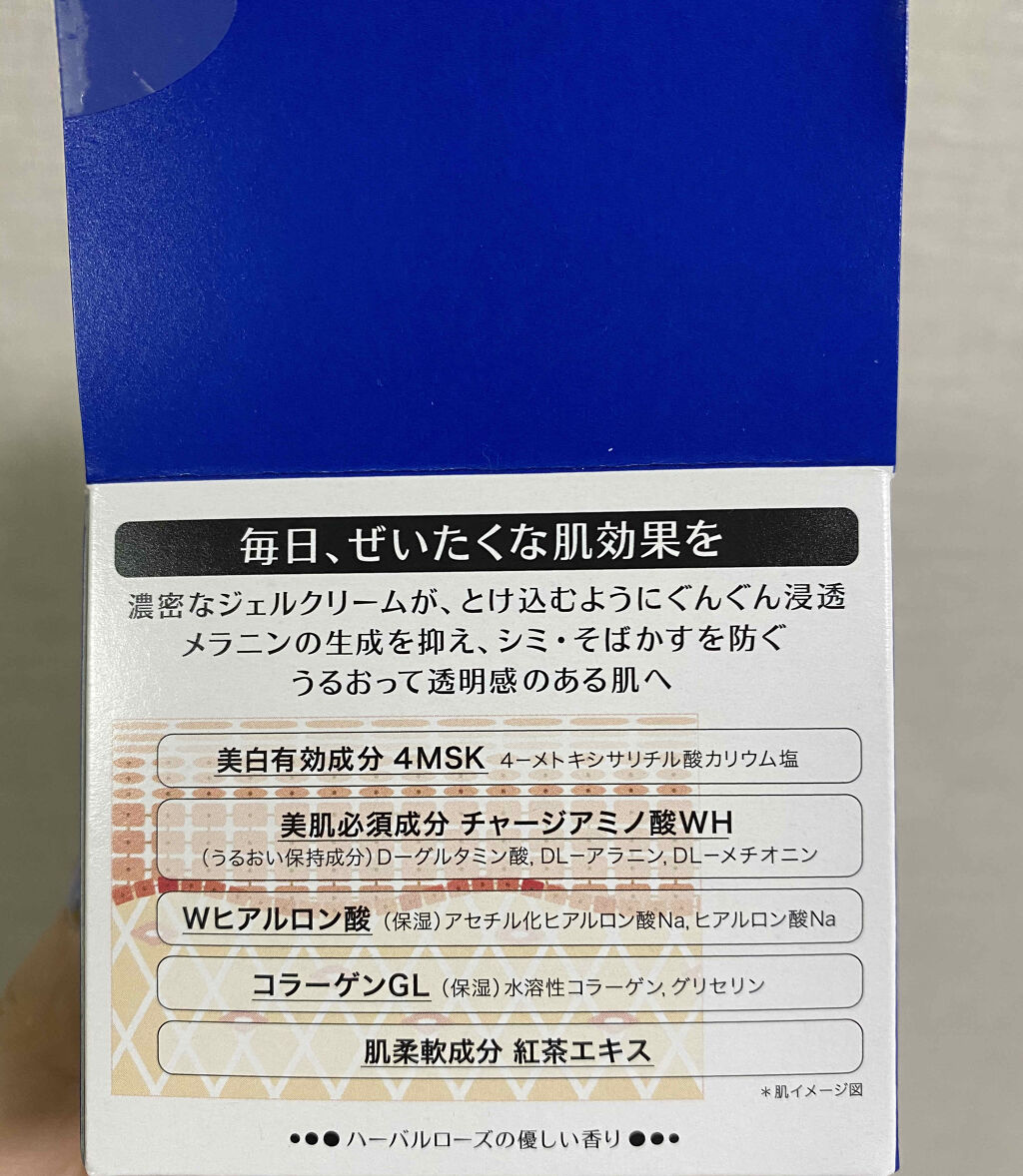 - 'まるでエステな美白ケア' うるおって、透明感 シミ対策!薬用濃密ジェルクリーム ○1品5機能(化粧水、乳液、クリーム、美容液、マスク)の効果をもつ高機能オールインワンジェルクリームです。 ○美白有効成分4MSK※2 配合 ※2 4-メトキシサリチル酸カリウム塩 メラニンの生成を抑え、シミ・そばかすを防ぎます。 ○'まるでエステな美白ケア'を叶えるトリプルエフェクト処方を搭載。使うたびに心地よく、まるでエステ気分を味わえます。 ○濃密なジェルクリームが、肌にとけ込むようにぐんぐんなじみます。 ○うるおって、透明感のある肌に導きます。 ○ハリと透明感のための美肌必須成分チャージアミノ酸WH※3 配合 ※3 (うるおい保持成分) D-グルタミン酸、DL-アラニン、DL-メチオニン ○Wヒアルロン酸配合 (保湿)アセチル化ヒアルロン酸Na、ヒアルロン酸Na ○コラーゲンGL配合 (保湿)水溶性コラーゲン、グリセリン 〇肌柔軟成分 紅茶エキス配合 〇ハーバルローズの優しい香りです。 ○アレルギーテスト済み (全てのかたにアレルギーが起きないというわけではありません。) 医薬部外品