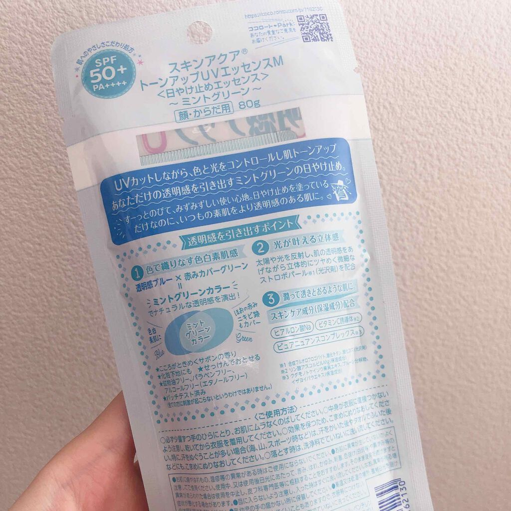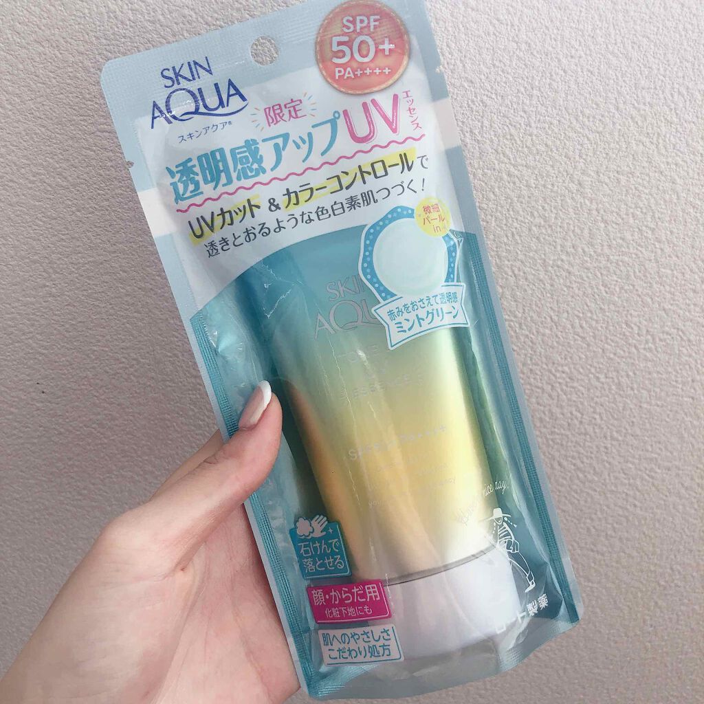 - ※カラー名称「ハピネスオーラ」は「ローズ」へ名称変更となりました。 <ミントグリーン> 赤み補正*1!UVカットしながら、色と光をコントロールし、肌をトーンアップ*1。 ミントグリーンカラーで透き通るような素肌つづく!エッセンスタイプの日焼け止め。 透明感*1のある肌に。 SPF50+、PA++++、UV耐水性★★。 鉱物油フリー。パラベンフリー。ときめくサボンの香り。 <ラベンダー> 明るさ補正*1!UVカットしながら、色と光をコントロールし、肌をトーンアップ*1。 透明感*1を引き出すラベンダーカラーの日焼け止め。 すーっとのびて、みずみずしい使い心地のエッセンスタイプ。 SPF50+、PA++++、UV耐水性★★。 鉱物油フリー。パラベンフリー。ときめくサボンの香り。 <ローズ> 血色感補正*1!UVカットしながら、色と光をコントロールし、肌をトーンアップ*1。 ローズカラーで血色をプラスし、透明感*1のある肌に。 エッセンスタイプの日焼け止め。 SPF50+、PA++++、UV耐水性★★。 パラベンフリー。ハピネスブロッサムの香り。 <ブルー> UVカットしながら、色と光をコントロールし、肌をトーンアップ*1。 血色感を抑えて儚げな色白肌*1に見せるブルーカラーの顔・からだ用日やけ止め。すーっとのびて、みずみずしい使い心地。 透明感ブルー×透明感ホワイト=はかなげブルーカラーで、自分史上最高*2の色白肌*1、うるおう美容液成分(うるおい成分)としてヒアルロン酸Na、ビタミンC誘導体*3配合。 SPF50+/PA++++。こころがときめくサボンの香り。化粧下地にも。石けんで落とせます。 パラベンフリー。鉱物油フリー。アレルギーテスト済み(全ての方にアレルギーが起こらないというわけではありません)。 *1:メイクアップ効果による *2:スキンアクアシリーズにおいて *3:リン酸アスコルビルMg(うるおい成分)