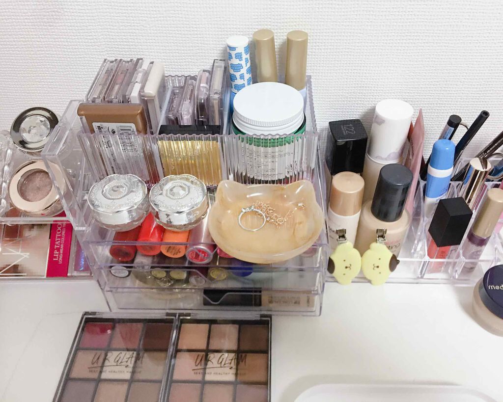 埋め込み式の棚を作ってもらったよ💓 上から下まで、ぜーんぶ好きなもので埋め尽くす。 デパコスへのこだわり!! 百均で買える、クリアケースやフィギュアを置く台もめちゃくちゃ活用できるからおすすめ! 無印のクリアケースはしっかりしてるから壊れにくくていいけど、高いからたくさん買うには百均でいいと思う!