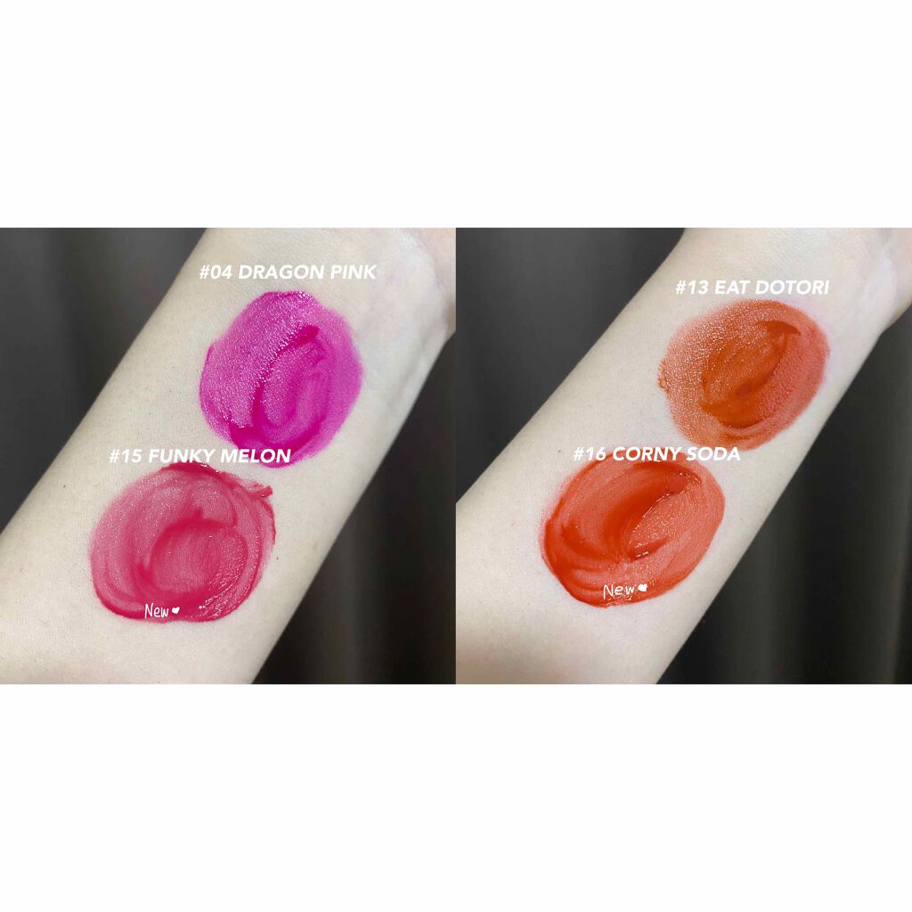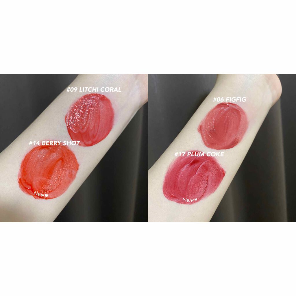 - <06 フィグフィグ(FIGFIG)> 水、オクチルドデカノール、ジメチコン、変性アルコール、アクリレーツコポリマー、ステアリン酸ソルビタン、エチルセルロース、ベヘニルアルコール、ペンチレングリコール、キウイエキス、パパイア果実エキス、グレープフルーツ果実エキス、ココヤシ果実エキス、マンゴー果実エキス、グアバ果実エキス、ポリソルベート60、シリカ、(アクリル酸Na/アクリロイルジメチルタウリンNa)コポリマー、リンゴ酸ジイソステアリル、トリイソステアリン酸ポリグリセリル-2、イソヘキサデカン、ポリソルベート80、ジイソステアリン酸ポリグリセリル-2、オレイン酸ソルビタン、エチルヘキシルグリセリン、BG、EDTA-2Na、フェノキシエタノール、香料、酸化チタン、酸化鉄、赤202、赤227、黄5、赤102、青1 <07 ジュジュブ(JUJUBE)> 水、オクチルドデカノール、ジメチコン、変性アルコール、アクリレーツコポリマー、ステアリン酸ソルビタン、エチルセルロース、ベヘニルアルコール、ペンチレングリコール、キウイエキス、パパイア果実エキス、グレープフルーツ果実エキス、ココヤシ果実エキス、マンゴー果実エキス、グアバ果実エキス、ポリソルベート60、シリカ、(アクリル酸Na/アクリロイルジメチルタウリンNa)コポリマー、トリイソステアリン酸ポリグリセリル-2、リンゴ酸ジイソステアリル、イソヘキサデカン、ポリソルベート80、ジイソステアリン酸ポリグリセリル-2、オレイン酸ソルビタン、エチルヘキシルグリセリン、BG、EDTA-2Na、フェノキシエタノール、香料、酸化チタン、酸化鉄、赤202、赤227、黄5、黄4、青1 <08 アップルブラウン(APPLE BROWN)> 水、オクチルドデカノール、ジメチコン、変性アルコール、アクリレーツコポリマー、ステアリン酸ソルビタン、エチルセルロース、ベヘニルアルコール、ペンチレングリコール、キウイエキス、パパイア果実エキス、グレープフルーツ果実エキス、ココヤシ果実エキス、マンゴー果実エキス、グアバ果実エキス、ポリソルベート60、シリカ、(アクリル酸Na/アクリロイルジメチルタウリンNa)コポリマー、トリイソステアリン酸ポリグリセリル-2、イソヘキサデカン、リンゴ酸ジイソステアリル、ポリソルベート80、ジイソステアリン酸ポリグリセリル-2、オレイン酸ソルビタン、エチルヘキシルグリセリン、BG、EDTA-2Na、フェノキシエタノール、香料、酸化鉄、黄5、赤202、酸化チタン、赤227、青1 <11 ピンクパンプキン(PINK PUMPKIN)> 水、オクチルドデカノール、ジメチコン、変性アルコール、アクリレーツコポリマー、ステアリン酸ソルビタン、エチルセルロース、ベヘニルアルコール、ペンチレングリコール、キウイエキス、パパイア果実エキス、グレープフルーツ果実エキス、ココヤシ果実エキス、マンゴー果実エキス、グアバ果実エキス、ポリソルベート60、シリカ、(アクリル酸Na/アクリロイルジメチルタウリンNa)コポリマー、リンゴ酸ジイソステアリル、イソヘキサデカン、トリイソステアリン酸ポリグリセリル-2、ポリソルベート80、ジイソステアリン酸ポリグリセリル-2、オレイン酸ソルビタン、エチルヘキシルグリセリン、BG、EDTA-2Na、フェノキシエタノール、香料、酸化チタン、酸化鉄、赤202、黄4、赤227、黄5、赤104(1) <22 ポメロスキン(POMELO SKIN)> 水、オクチルドデカノール、ジメチコン、変性アルコール、アクリレーツコポリマー、ポリソルベート60、エチルセルロース、ベヘニルアルコール、ペンチレングリコール、(アクリル酸Na/アクリロイルジメチルタウリンNa)コポリマー、シリカ、ステアリン酸ソルビタン、イソヘキサデカン、リンゴ酸ジイソステアリル、フェノキシエタノール、酸化チタン、トリイソステアリン酸ポリグリセリル-2、ポリソルベート80、酸化鉄、香料、オレイン酸ソルビタン、エチレンジアミンジコハク酸3Na、エチルヘキシルグリセリン、赤202、ジイソステアリン酸ポリグリセリル-2、赤227、黄5、青1、BG、キウイエキス、パパイア果実エキス、グレープフルーツ果実エキス、ココヤシ果実、マンゴー果実エキス、グアバ果実エキス <23 ヌカダミア(NUCADAMIA)> 水、オクチルドデカノール、ジメチコン、変性アルコール、アクリレーツコポリマー、ポリソルベート60、エチルセルロース、ベヘニルアルコール、ペンチレングリコール、(アクリル酸Na/アクリロイルジメチルタウリンNa)コポリマー、シリカ、ステアリン酸ソルビタン、イソヘキサデカン、フェノキシエタノール、リンゴ酸ジイソステアリル、酸化チタン、ポリソルベート80、トリイソステアリン酸ポリグリセリル-2、酸化鉄、香料、オレイン酸ソルビタン、エチレンジアミンジコハク酸3Na、赤202、赤227、黄5、ジイソステアリン酸ポリグリセリル-2、エチルヘキシルグリセリン、黄4、青1、BG、キウイエキス、パパイア果実エキス、グレープフルーツ果実エキス、ココヤシ果実、マンゴー果実エキス <24 ピーリングエンドゥ(PEELING ANGDOO)> 水、オクチルドデカノール、ジメチコン、変性アル