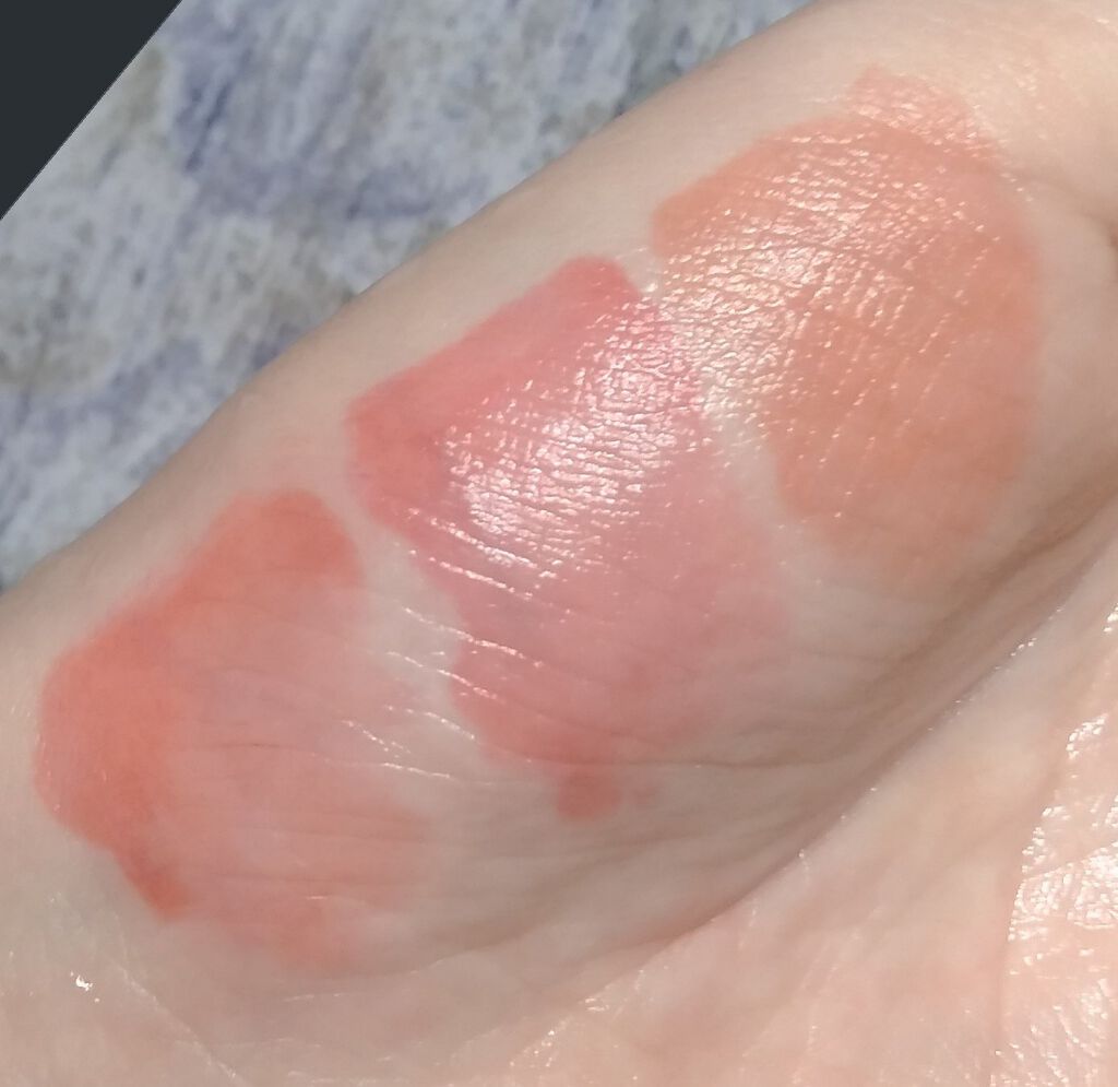 発色がとても良く、 塗ってすぐティッシュオフしてもかなり色が残っています。 うるっと感も残るのが良い! 唇では1度塗りティッシュオフだとムラがあったので繰り返して何度か塗ると良さそう✨ マンゴーのような甘ったるい香りだと感じました。 複数持った場合に見分けは付きにくくなるけどシンプルなパッケージも好き🥰