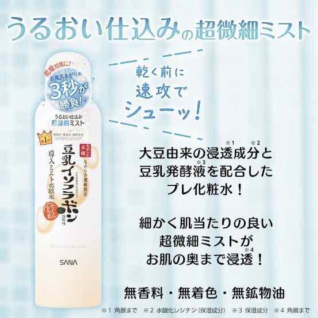 - 2023年2月7日リニューアル 1.高純度豆乳イソフラボン※1×豆乳発酵液※1×ヒト型セラミド※2配合 九州産丸大豆「ふくゆたか」から作られた高純度豆乳イソフラボン※1と豆乳発酵液※1を贅沢に配合。 さらにヒト型セラミド※2配合でお肌にうるおいを与えます。 2.超微細ミストでうるおいケア! 毛穴より細かく、肌あたりの良いマイクロミストが角層まで浸透※3し、うるおいのあるお肌に導きます。 大豆由来の浸透※3成分※4がお肌に必要な油分と水分の両方を引き付けながら浸透※3! 化粧水やオールインワンジェルの前の使用がおすすめです。 3.全身にもより使いやすく! 倒立(逆さ)での使用も可能。背中など、全身にもお使いいただきやすくなりました。 4.無香料・無着色・無鉱物油 5.各種試験を実施 ・アレルギーテスト済み ・パッチテスト済み (すべての方にアレルギー等が起きないというわけではありません) ※1 保湿成分 ※2 セラミドNG(保湿成分) ※3 角層まで ※4 水酸化レシチン(保湿成分)
