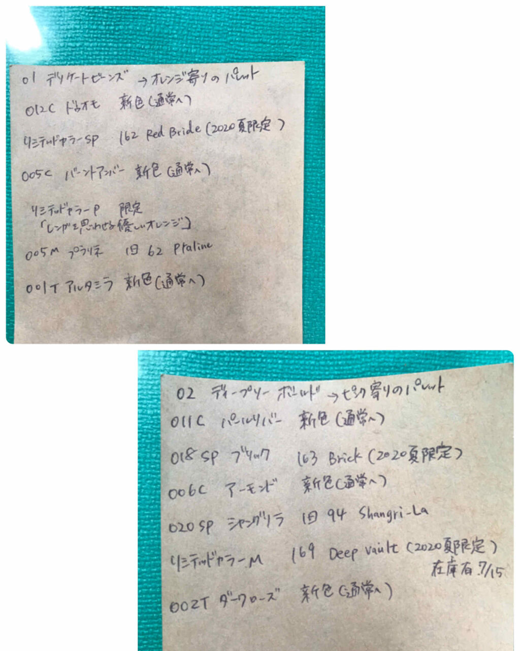 【アディクションリニューアル】リニューアルに伴い無くなるカラーも。お店からもらっていたカタログ?に・残るカラー(数字書き込み分)・自分の手持ち(赤スラッシュ) (赤バツは人に譲った分、78.55はミスで 今も手持ちにいる分)の書き込みメモをし...