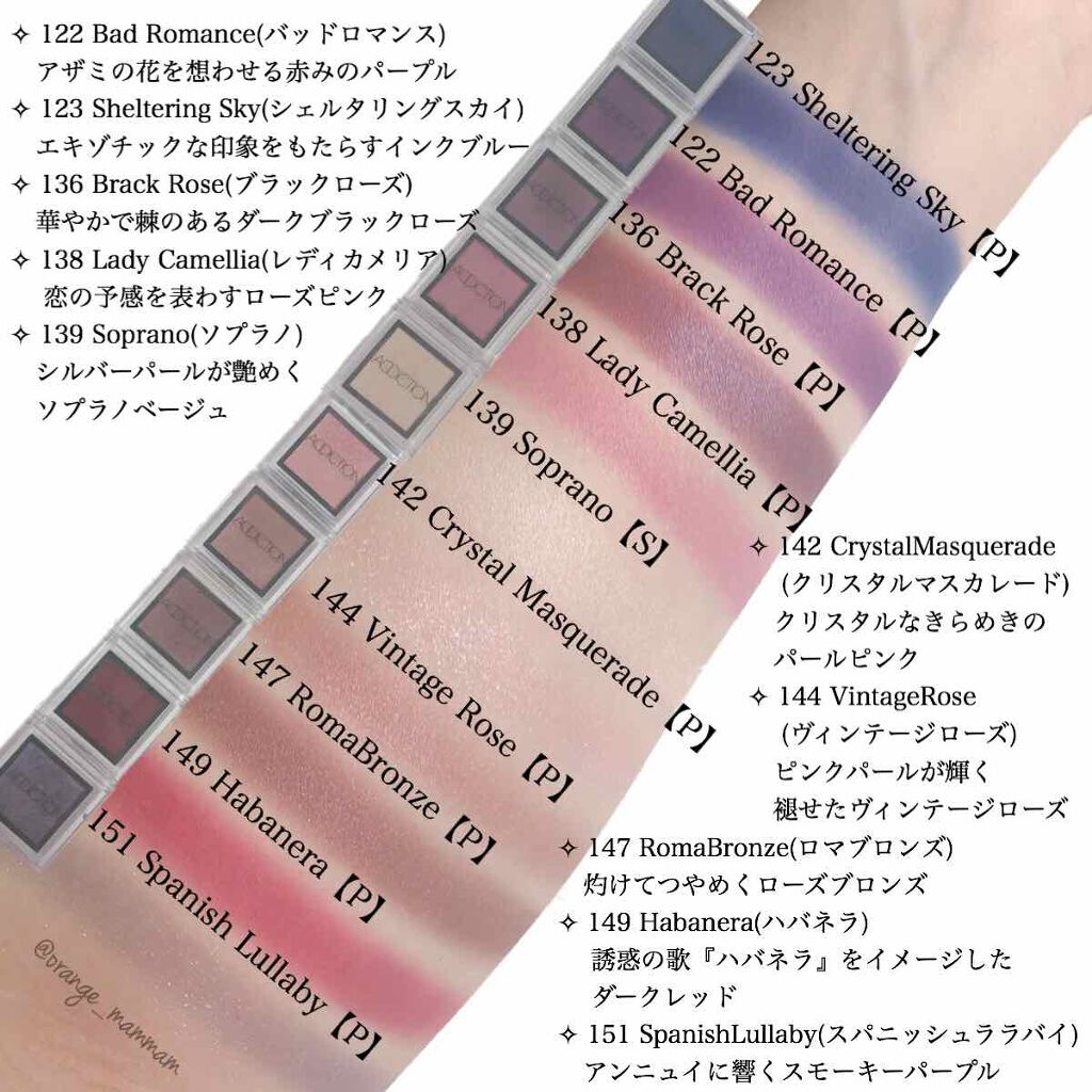 - ベーシックなカラーが豊富な 9レンジで、美しく絶妙なグラデーション、質感。 ■シルキー (S):うっすらと色づき、繊細なパールのニュアンスを与える新テクスチャー。 これまでにないスルスルとした感触が特徴的! 透明感が高いので、まるでヴェールをまとったように繊細なパール感が際立ち、アイシャドウの上に重ねづけすることも可能です。 ■マット (M): 発色が高く、見たままの色をうらぎらないノンパールでマットな仕上がり。 色味により、最適なベースを使用し、 オペーク感や透明感、パウダリーやしっとり感のあるものまで、仕上がりもさまざまです。 ■パール (P): 繊細なパールからリッチなものまで、バリエーションが豊富。個々のパール感により、最適なベースを採用。 繊細なパール感と発色を同時にかなえ、美しい仕上がりをキープします。 パールの中にもつや感、濡れ感、透明感など、あらゆる仕上がりが存在します。 ■メタリック (ME):パールやラメの輝きが特徴的な、つややかでメタリックな仕上がり。 肌へのフィット性が高く、メタリックな仕上がりが持続します。