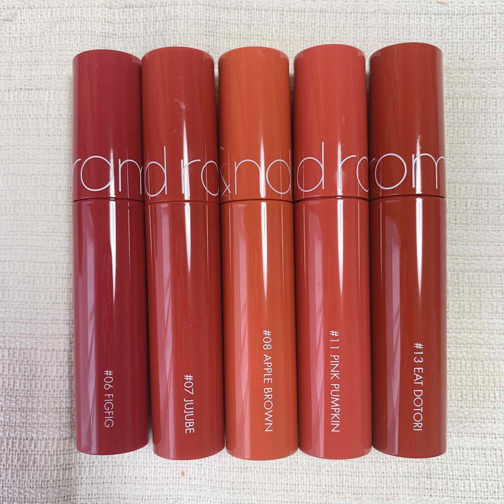 rom&ndのティントはフレッシュなオレンジは数が少なく定番だと01番だけ(だと思います) 深みのあるオレンジやオレンジブラウン系になると一気に色が増える!! 濃いめの発色は13,20あたりで08のアップルブラウンは濃すぎず比較的使いやすい色味だと思います👌 使いやすいヌードよりの色味が一気に増えたrom&nd もともとFIGFIGやJUJUBEが使いやすい!と人気でしたが、新色が増えてよりヌードなカラーが増えました👏 1番ベージュ系に近いのは新作の22,23あたり FIGFIGとJUJUBEをよりイマドキの色に仕上げたのが18,19あたりになります 個人的に好きなのは10,11あたりです 使いやすいし血色感もほどよくでる🌟 パッケージがその色になってるので結構どんな色か分かりやすいrom&nd 比較するとこれよりは赤いのかとか薄いのかなど分かるので参考にしてみて下さい🙌