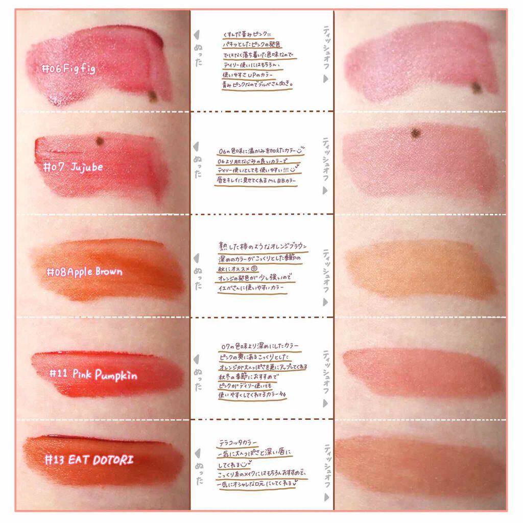 - <06 フィグフィグ(FIGFIG)> 水、オクチルドデカノール、ジメチコン、変性アルコール、アクリレーツコポリマー、ステアリン酸ソルビタン、エチルセルロース、ベヘニルアルコール、ペンチレングリコール、キウイエキス、パパイア果実エキス、グレープフルーツ果実エキス、ココヤシ果実エキス、マンゴー果実エキス、グアバ果実エキス、ポリソルベート60、シリカ、(アクリル酸Na/アクリロイルジメチルタウリンNa)コポリマー、リンゴ酸ジイソステアリル、トリイソステアリン酸ポリグリセリル-2、イソヘキサデカン、ポリソルベート80、ジイソステアリン酸ポリグリセリル-2、オレイン酸ソルビタン、エチルヘキシルグリセリン、BG、EDTA-2Na、フェノキシエタノール、香料、酸化チタン、酸化鉄、赤202、赤227、黄5、赤102、青1 <07 ジュジュブ(JUJUBE)> 水、オクチルドデカノール、ジメチコン、変性アルコール、アクリレーツコポリマー、ステアリン酸ソルビタン、エチルセルロース、ベヘニルアルコール、ペンチレングリコール、キウイエキス、パパイア果実エキス、グレープフルーツ果実エキス、ココヤシ果実エキス、マンゴー果実エキス、グアバ果実エキス、ポリソルベート60、シリカ、(アクリル酸Na/アクリロイルジメチルタウリンNa)コポリマー、トリイソステアリン酸ポリグリセリル-2、リンゴ酸ジイソステアリル、イソヘキサデカン、ポリソルベート80、ジイソステアリン酸ポリグリセリル-2、オレイン酸ソルビタン、エチルヘキシルグリセリン、BG、EDTA-2Na、フェノキシエタノール、香料、酸化チタン、酸化鉄、赤202、赤227、黄5、黄4、青1 <08 アップルブラウン(APPLE BROWN)> 水、オクチルドデカノール、ジメチコン、変性アルコール、アクリレーツコポリマー、ステアリン酸ソルビタン、エチルセルロース、ベヘニルアルコール、ペンチレングリコール、キウイエキス、パパイア果実エキス、グレープフルーツ果実エキス、ココヤシ果実エキス、マンゴー果実エキス、グアバ果実エキス、ポリソルベート60、シリカ、(アクリル酸Na/アクリロイルジメチルタウリンNa)コポリマー、トリイソステアリン酸ポリグリセリル-2、イソヘキサデカン、リンゴ酸ジイソステアリル、ポリソルベート80、ジイソステアリン酸ポリグリセリル-2、オレイン酸ソルビタン、エチルヘキシルグリセリン、BG、EDTA-2Na、フェノキシエタノール、香料、酸化鉄、黄5、赤202、酸化チタン、赤227、青1 <11 ピンクパンプキン(PINK PUMPKIN)> 水、オクチルドデカノール、ジメチコン、変性アルコール、アクリレーツコポリマー、ステアリン酸ソルビタン、エチルセルロース、ベヘニルアルコール、ペンチレングリコール、キウイエキス、パパイア果実エキス、グレープフルーツ果実エキス、ココヤシ果実エキス、マンゴー果実エキス、グアバ果実エキス、ポリソルベート60、シリカ、(アクリル酸Na/アクリロイルジメチルタウリンNa)コポリマー、リンゴ酸ジイソステアリル、イソヘキサデカン、トリイソステアリン酸ポリグリセリル-2、ポリソルベート80、ジイソステアリン酸ポリグリセリル-2、オレイン酸ソルビタン、エチルヘキシルグリセリン、BG、EDTA-2Na、フェノキシエタノール、香料、酸化チタン、酸化鉄、赤202、黄4、赤227、黄5、赤104(1) <22 ポメロスキン(POMELO SKIN)> 水、オクチルドデカノール、ジメチコン、変性アルコール、アクリレーツコポリマー、ポリソルベート60、エチルセルロース、ベヘニルアルコール、ペンチレングリコール、(アクリル酸Na/アクリロイルジメチルタウリンNa)コポリマー、シリカ、ステアリン酸ソルビタン、イソヘキサデカン、リンゴ酸ジイソステアリル、フェノキシエタノール、酸化チタン、トリイソステアリン酸ポリグリセリル-2、ポリソルベート80、酸化鉄、香料、オレイン酸ソルビタン、エチレンジアミンジコハク酸3Na、エチルヘキシルグリセリン、赤202、ジイソステアリン酸ポリグリセリル-2、赤227、黄5、青1、BG、キウイエキス、パパイア果実エキス、グレープフルーツ果実エキス、ココヤシ果実、マンゴー果実エキス、グアバ果実エキス <23 ヌカダミア(NUCADAMIA)> 水、オクチルドデカノール、ジメチコン、変性アルコール、アクリレーツコポリマー、ポリソルベート60、エチルセルロース、ベヘニルアルコール、ペンチレングリコール、(アクリル酸Na/アクリロイルジメチルタウリンNa)コポリマー、シリカ、ステアリン酸ソルビタン、イソヘキサデカン、フェノキシエタノール、リンゴ酸ジイソステアリル、酸化チタン、ポリソルベート80、トリイソステアリン酸ポリグリセリル-2、酸化鉄、香料、オレイン酸ソルビタン、エチレンジアミンジコハク酸3Na、赤202、赤227、黄5、ジイソステアリン酸ポリグリセリル-2、エチルヘキシルグリセリン、黄4、青1、BG、キウイエキス、パパイア果実エキス、グレープフルーツ果実エキス、ココヤシ果実、マンゴー果実エキス <24 ピーリングエンドゥ(PEELING ANGDOO)> 水、オクチルドデカノール、ジメチコン、変性アル