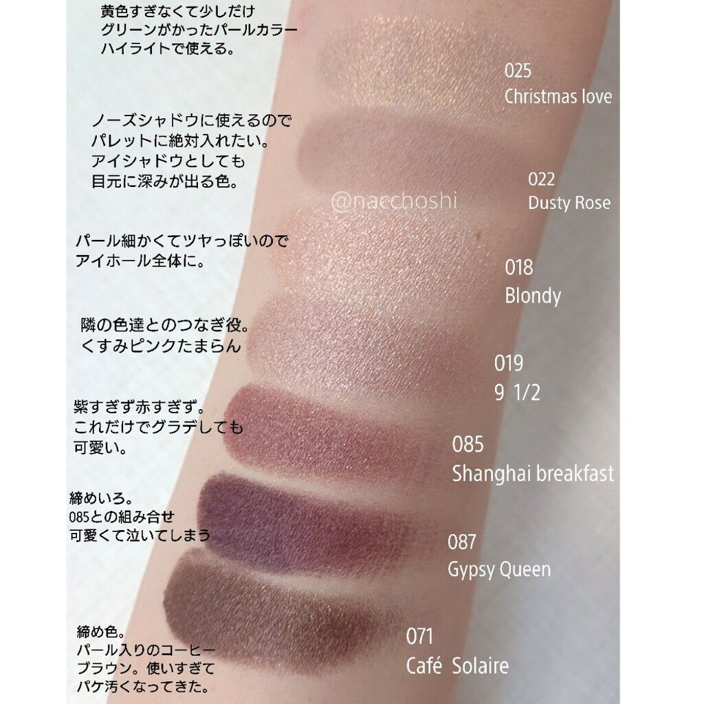 - ベーシックなカラーが豊富な 9レンジで、美しく絶妙なグラデーション、質感。 ■シルキー (S):うっすらと色づき、繊細なパールのニュアンスを与える新テクスチャー。 これまでにないスルスルとした感触が特徴的! 透明感が高いので、まるでヴェールをまとったように繊細なパール感が際立ち、アイシャドウの上に重ねづけすることも可能です。 ■マット (M): 発色が高く、見たままの色をうらぎらないノンパールでマットな仕上がり。 色味により、最適なベースを使用し、 オペーク感や透明感、パウダリーやしっとり感のあるものまで、仕上がりもさまざまです。 ■パール (P): 繊細なパールからリッチなものまで、バリエーションが豊富。個々のパール感により、最適なベースを採用。 繊細なパール感と発色を同時にかなえ、美しい仕上がりをキープします。 パールの中にもつや感、濡れ感、透明感など、あらゆる仕上がりが存在します。 ■メタリック (ME):パールやラメの輝きが特徴的な、つややかでメタリックな仕上がり。 肌へのフィット性が高く、メタリックな仕上がりが持続します。
