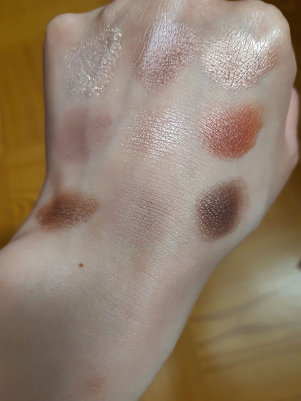 100円とは思えない発色の良さで、ラメが細かいものからグリッターまで色・質感が違うものが入っています イエベ向きの無難なブラウンで使いやすい🙆♀️ 全体的に粉飛び、崩れやすさがあるので、アイシャドウベースを使った方がいいと思います🦖⋆͛