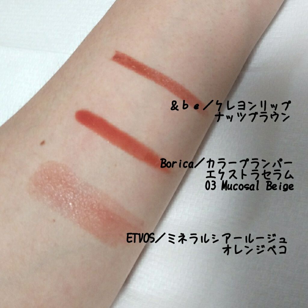 発色···ローラメルシエが 「ヌードベージュ」 だとしたら、ルナソルは 「ゴールド(?)っぽい」 かな。肌色に溶け込んで、発色は わからないけどね。 艶···薄く塗ると自然なツヤ感。 たっぷり塗ればゴージャスな感じに。