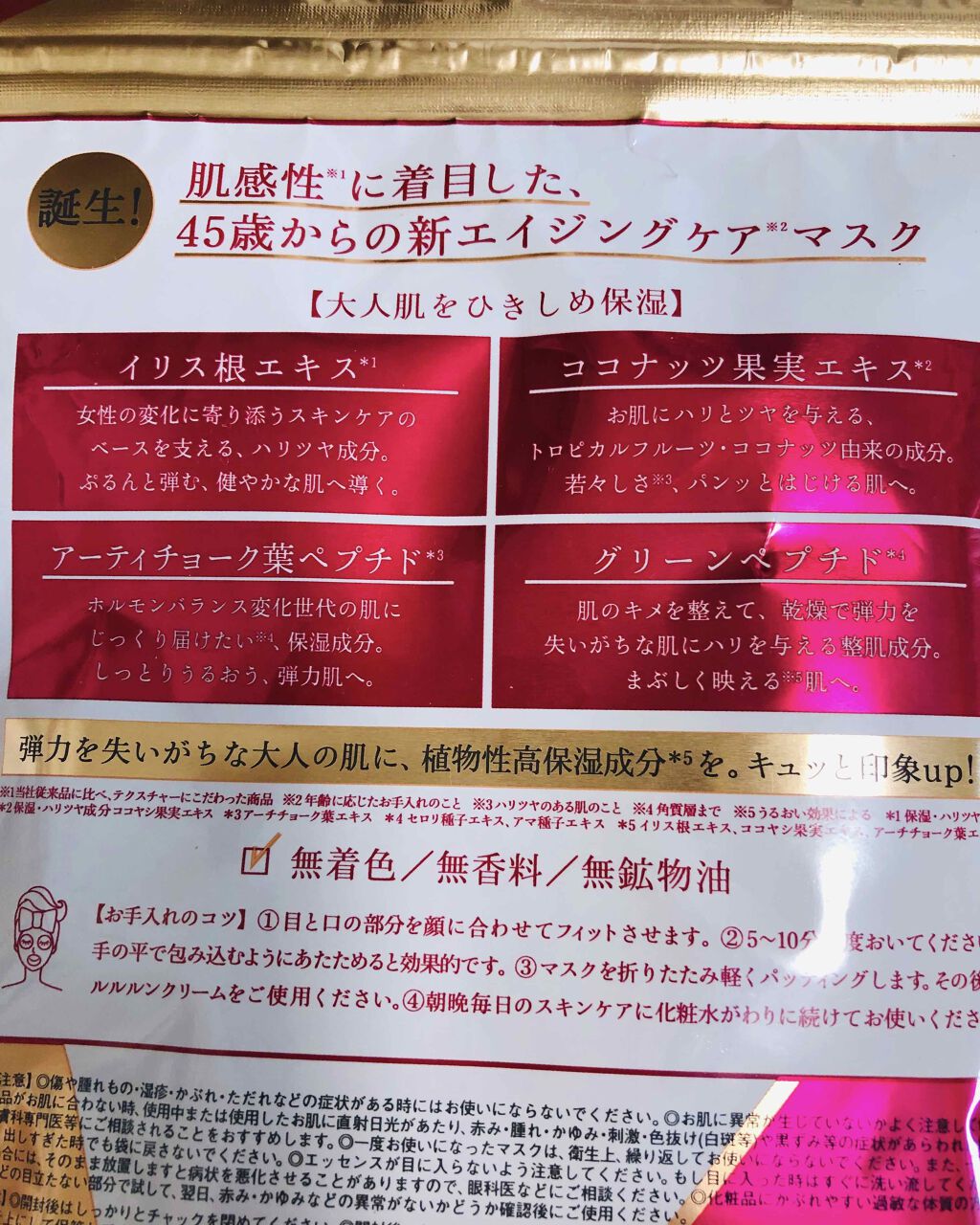 - リニューアル発売。 大人の肌をキュッとひきしめ弾力のある肌へ導く“ひきしめ保湿”マスク。ハリ不足な大人の肌におすすめです。 果実ナツメ由来のハリツヤ成分「ナツメ果実エキス」、女性の変化に寄り添い、肌を整えるハリツヤ成分「黄杞葉エキス*」を配合。みずみずしく弾力のある肌へ導くだけでなく、ハリを与え肌をキュッと引き締めます。 無着色/無香料/無鉱物油/アルコールフリー。肌のことを考えた低刺激処方。 (※ 角質層 * ハリツヤ成分 コウキ葉エキス)