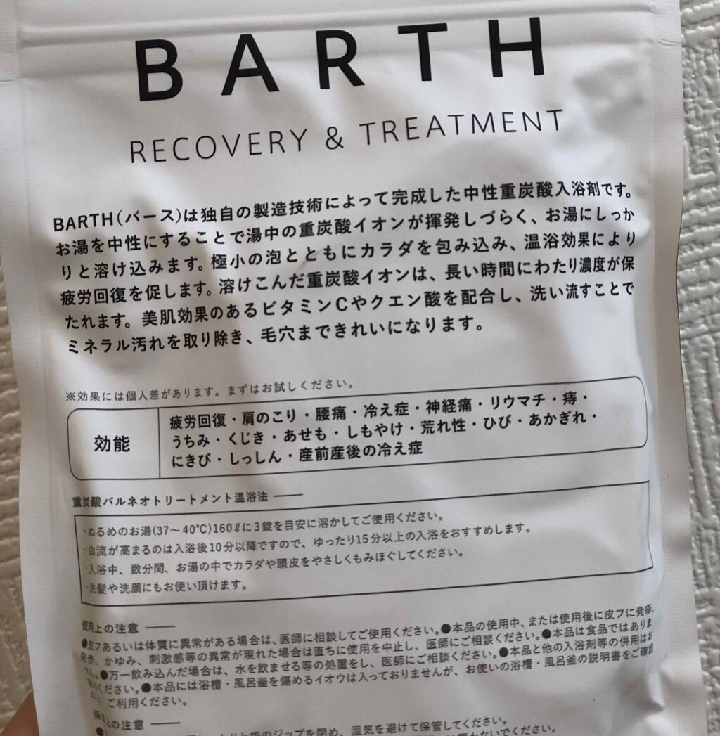 - 【医薬部外品】 ポイント① 溶け込む重炭酸イオン BARTH は独自の製造技術で、重曹とクエン酸の反応を科学的に計算されたタイミングで安定化させ、お湯を中性に保つことで 、重炭酸イオンの 8 ~ 9 割を湯中に溶け込ませることに成功しました。重炭酸イオンがしっかり溶け込んだお湯に入浴することで、有効成分が血流を促進し、疲労回復を促します。 ポイント② 自然由来のクエン酸 BARTHは、炭酸ガスを発生させるための酸を石油合成ではなく、自然生成物(でんぷん)の発酵で得られるクエン酸を使用しています。従来クエン酸は反応性が高くすぐに揮発してしまうため、重曹と配合して錠剤にすることが極めて困難だと言われてきました。 自然由来のクエン酸と炭酸ガスの組み合わせが、お肌のキメを整え柔らかくし、美肌効果をもたらします。 ポイント③塩素を中和するビタミンC配合 ビタミンCを配合したことで、一般家庭で使われる水道水の中に含まれている塩素を中和し、刺激の少ない肌触りのよいお湯を可能にしました。 敏感肌の方や、お子様にも安心してご入浴いただけます。 ポイント④無着色・無香料 着色料や香料などを一切使用せず、余計なものを削ぎ落としました。