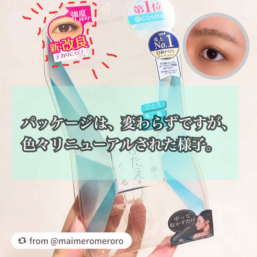 - 2020年6月3日 膜が強くなってリニューアル発売! 塗って乾かすだけのふたえ整形フィルム。見えない膜がふたえをつくり、自然なふたえが完成します。非接着タイプでまぶたを貼り付けないので、目を閉じても自然な仕上がり。まばたきしてもつっぱりません。水・汗に強いウォータプルーフでクッキリふたえをキープ。うるおい成分のヒアルロン酸・コラーゲン配合。
