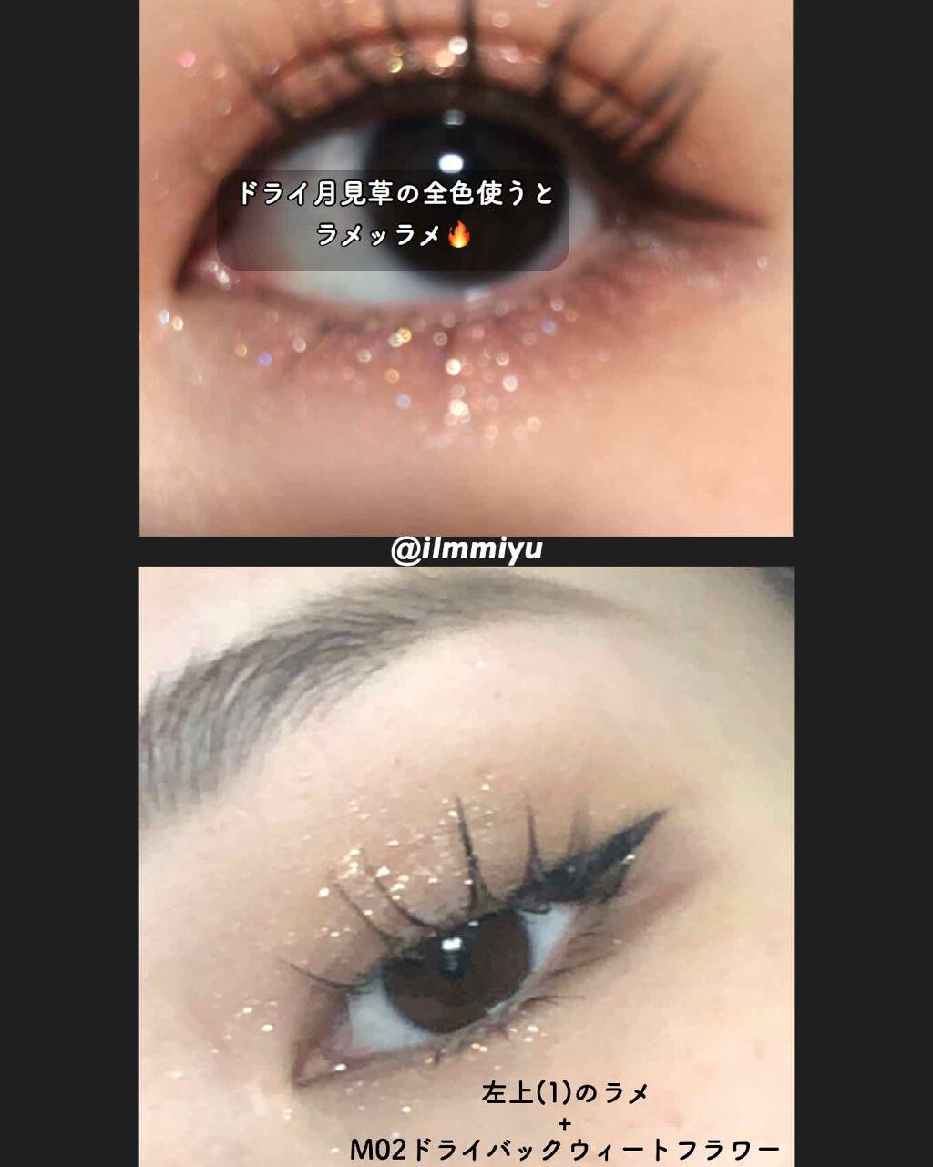 - ①きれいな#月見グリッター。それぞれ違う4種類のテクスチャー、カラー、パールがキラキラと広がる月光グリッターが透明に輝く厚くならない目元にします。②きれいな#プライマーシャドウ。きれいなマットのテクスチャーが目元をさらさらに整え、崩れのないメイクをそのまま維持します。③きれいな#ドライフラワーカラー。ドライフラワーで見つけた優しいカラーで目元を染めます。