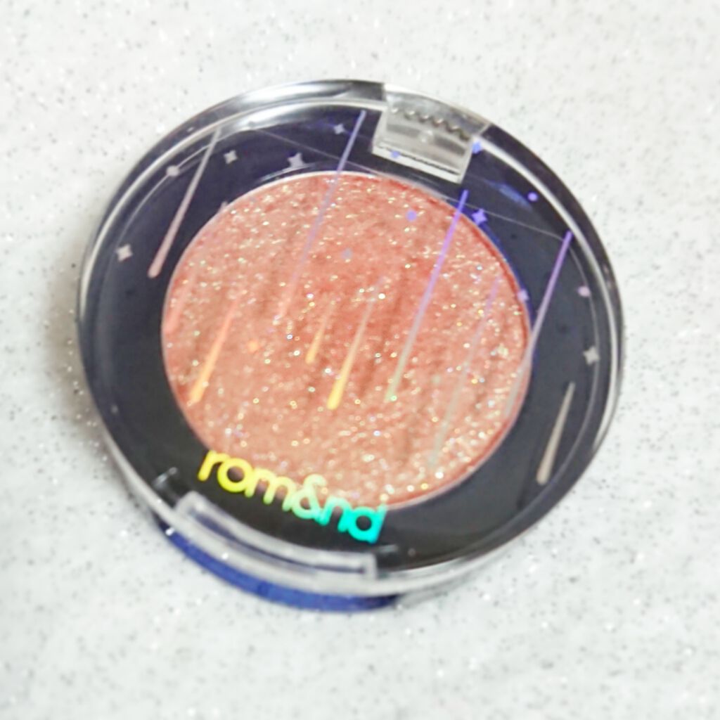 rom&ndグリッターシャドウカラー05OURGALAXYブラウンベースにブルー、ピンク、ゴールドのグリッターがぎっしり!角度によって変化するキラキラが宇宙のようで、とても存在感のある輝きが魅力です。薄くて柔らかいグリッターだから密着力が高く...