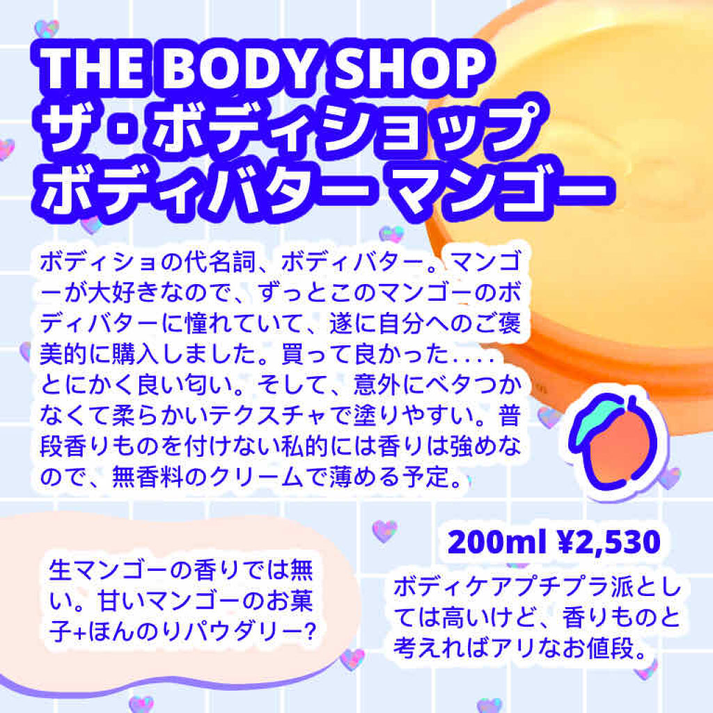 THEBODYSHOP(ザ・ボディショップ)ボディバター🥭マンゴー50ml(46g)\おいしそうな香りがたまらん🤤/バターというよりはもう少しほわっとしたフロマージュ?みたいなテクスチャー。硬さはシア(ベリードライ肌用)よりは少しライトでやわ...