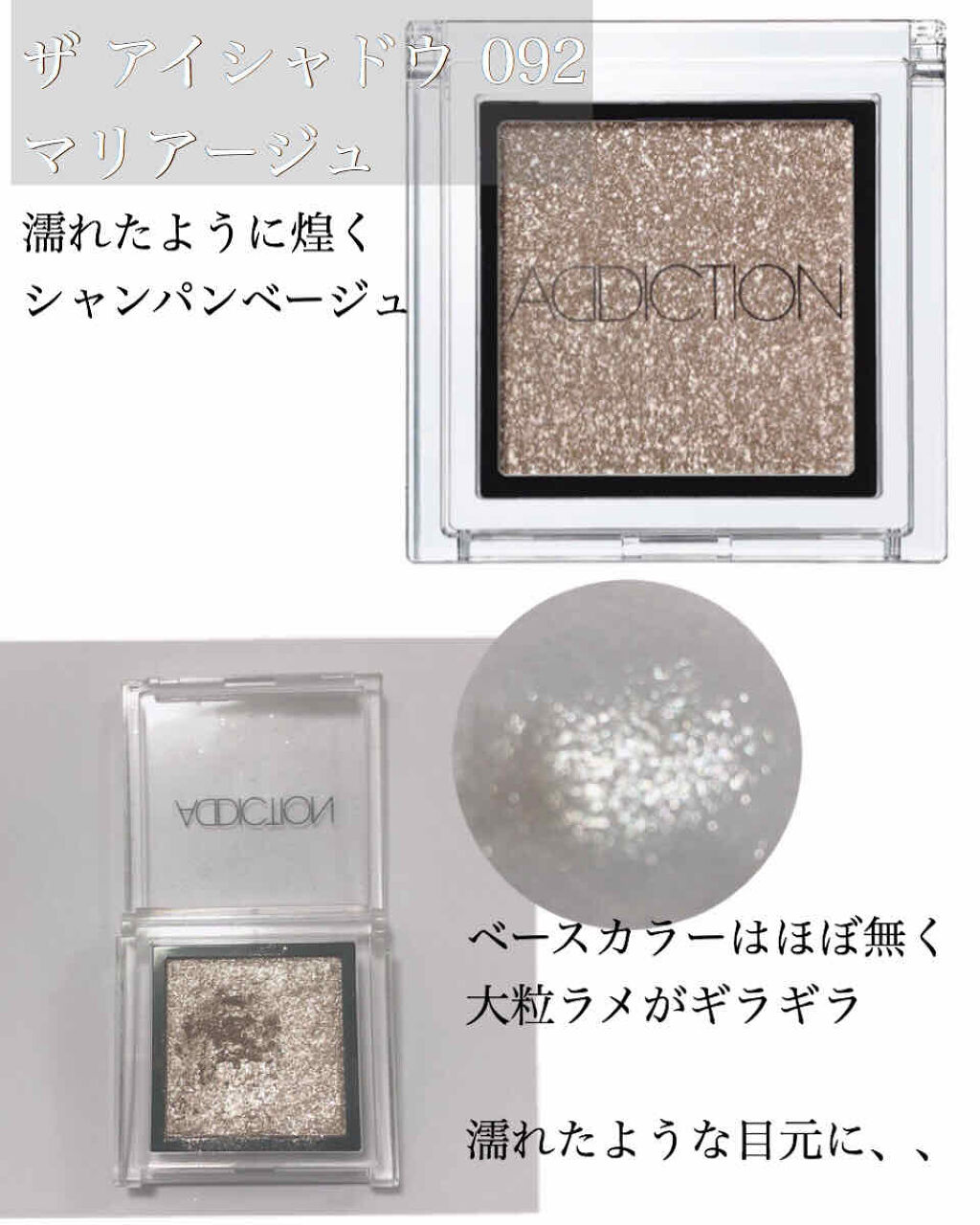 ほんの少し乗せるだけで目元が一気に華やかに!華やかな結婚式やパーティーにはもちろん冬のイルミネーションデートでも大活躍してくれそう!🥰✨ 大粒のラメとパールがぎっしりで密着力が高くて、ヨレにくい!💎 マットなアイシャドウにポイントで瞼の中心に乗せたり涙袋に乗せて、濡れたようなツヤ感とキラキラが煌めく目元を演出できて可愛すぎる!!🥹❤️✨