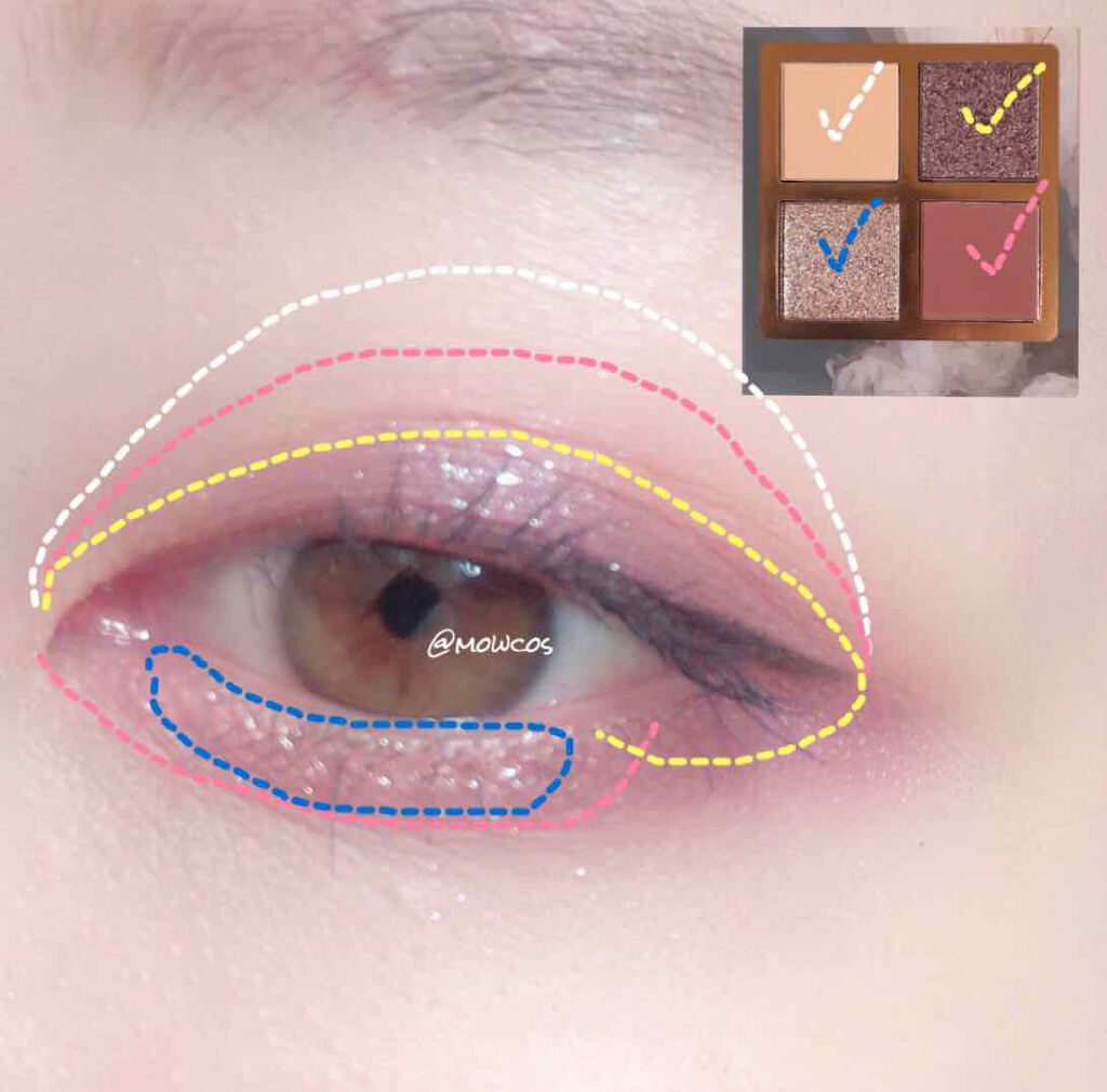 可愛い4色アイシャドウ✨ 落として②がひび割れました😂 見た目が③は黒にラメのシャドウかと思っていたのですが 塗って肌にのせると赤っぽい、ピンク紫?っぽい感じの色でした❣️ ポイントで涙袋キラキラするので涙袋に使用しても可愛い感じでした💕